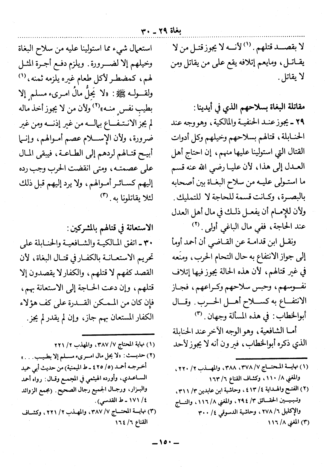 30 - اتَّفَقَ الْمَالِكِيَّةُ وَالشَّافِعِيَّةُ وَالْحَنَابِلَةُ عَلَى تَحْرِيمِ الاِسْتِعَانَةِ بِالْكُفَّارِ فِي قِتَال الْبُغَاةِ؛ لأَِنَّ الْقَصْدَ كَفُّهُمْ لاَ قَتْلُهُمْ، وَالْكُفَّارُ لاَ يَقْصِدُونَ إِلاَّ قَتْلَهُمْ، وَإِنْ دَعَتِ الْحَاجَةُ إِلَى الاِسْتِعَانَةِ بِهِمْ، فَإِنْ كَانَ مِنَ الْمُمْكِنِ الْقُدْرَةُ عَلَى كَفِّ هَؤُلاَءِ الْكُفَّارِ الْمُسْتَعَانِ بِهِمْ جَازَ، وَإِنْ لَمْ يُقْدَرْ لَمْ يَجُزْ.
