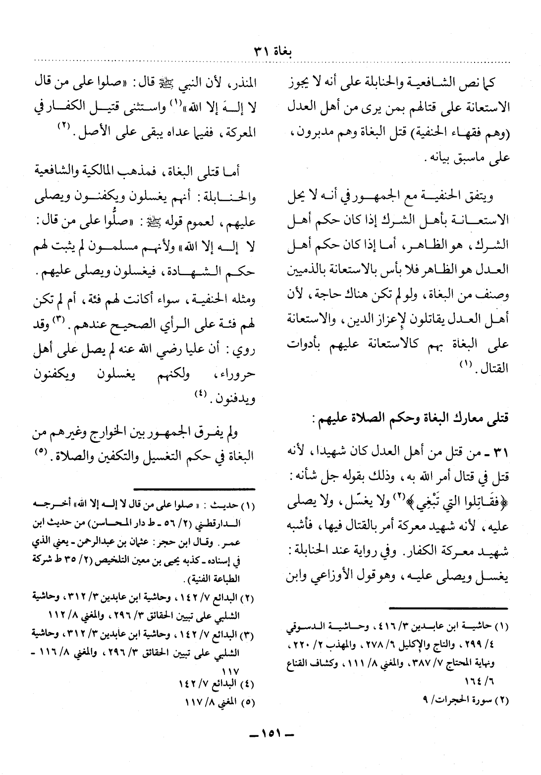 31 - مَنْ قُتِل مِنْ أَهْل الْعَدْل كَانَ شَهِيدًا؛ لأَِنَّهُ قُتِل فِي قِتَالٍ أَمَرَ اللَّهُ بِهِ، وَذَلِكَ بِقَوْلِهِ جَل شَأْنُهُ: {فَقَاتِلُوا الَّتِي تَبْغِي} (2) وَلاَ يُغَسَّل، وَلاَ يُصَلَّى عَلَيْهِ؛ لأَِنَّهُ شَهِيدُ مَعْرَكَةٍ أُمِرَ بِالْقِتَال فِيهَا، فَأَشْبَهَ شَهِيدَ مَعْرَكَةِ الْكُفَّارِ. وَفِي رِوَايَةٍ عِنْدَ الْحَنَابِلَةِ: يُغَسَّل وَيُصَلِّي عَلَيْهِ، وَهُوَ قَوْل الأَْوْزَاعِيِّ وَابْنِ