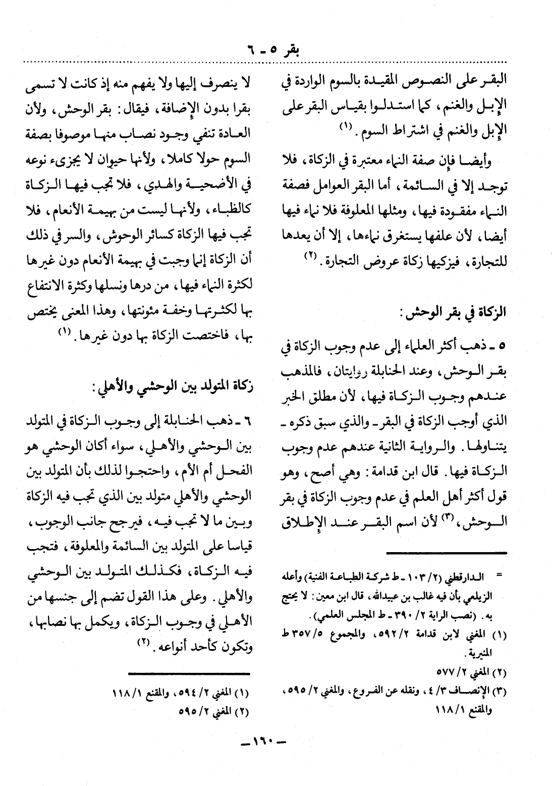 5 - ذَهَبَ أَكْثَرُ الْعُلَمَاءِ إِلَى عَدَمِ وُجُوبِ الزَّكَاةِ فِي بَقَرِ الْوَحْشِ، وَعِنْدَ الْحَنَابِلَةِ رِوَايَتَانِ، فَالْمَذْهَبُ عِنْدَهُمْ وُجُوبُ الزَّكَاةِ فِيهَا؛ لأَِنَّ مُطْلَقَ الْخَبَرِ الَّذِي أَوْجَبَ الزَّكَاةَ فِي الْبَقَرِ - وَالَّذِي سَبَقَ ذِكْرُهُ - يَتَنَاوَلُهَا. وَالرِّوَايَةُ الثَّانِيَةُ عِنْدَهُمْ عَدَمُ وُجُوبِ الزَّكَاةِ فِيهَا. قَال ابْنُ قُدَامَةَ: وَهِيَ أَصَحُّ، وَهُوَ قَوْل أَكْثَرِ أَهْل الْعِلْمِ فِي عَدَمِ وُجُوبِ الزَّكَاةِ فِي بَقَرِ الْوَحْشِ (3) ؛ لأَِنَّ اسْمَ الْبَقَرِ عِنْدَ الإِْطْلاَقِ