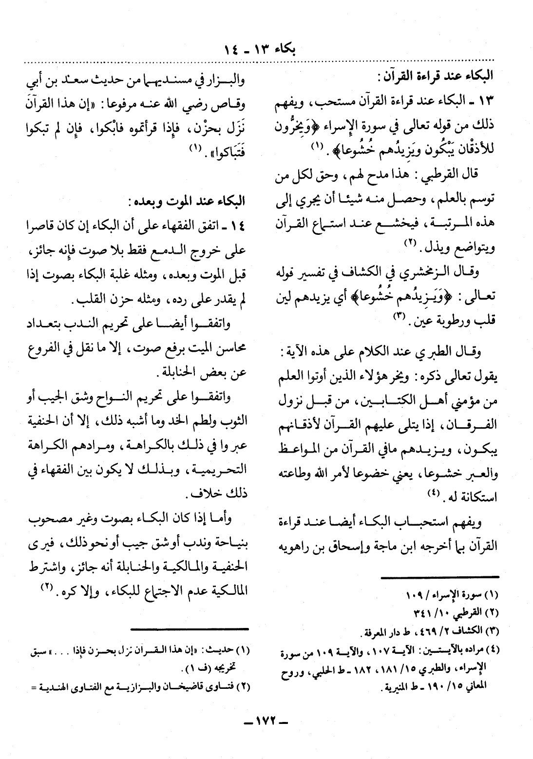13 - الْبُكَاءُ عِنْدَ قِرَاءَةِ الْقُرْآنِ مُسْتَحَبٌّ، وَيُفْهَمُ ذَلِكَ مِنْ قَوْله تَعَالَى فِي سُورَةِ الإِْسْرَاءِ {وَيَخِرُّونَ لِلأَْذْقَانِ يَبْكُونَ وَيَزِيدُهُمْ خُشُوعًا} . (1)