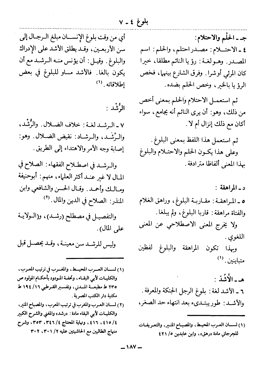 (2) لسان العرب والمغرب في ترتيب المعرب، والمصباح المنير، والكليات لأبي البقاء مادة: " رشد " والمغني والشرح الكبير 4 / 415، 416، ونهاية المحتاج 4 / 346، 353، وشرح منهاج الطالبين مع الحاشيتين عليه 2 / 301، 302.