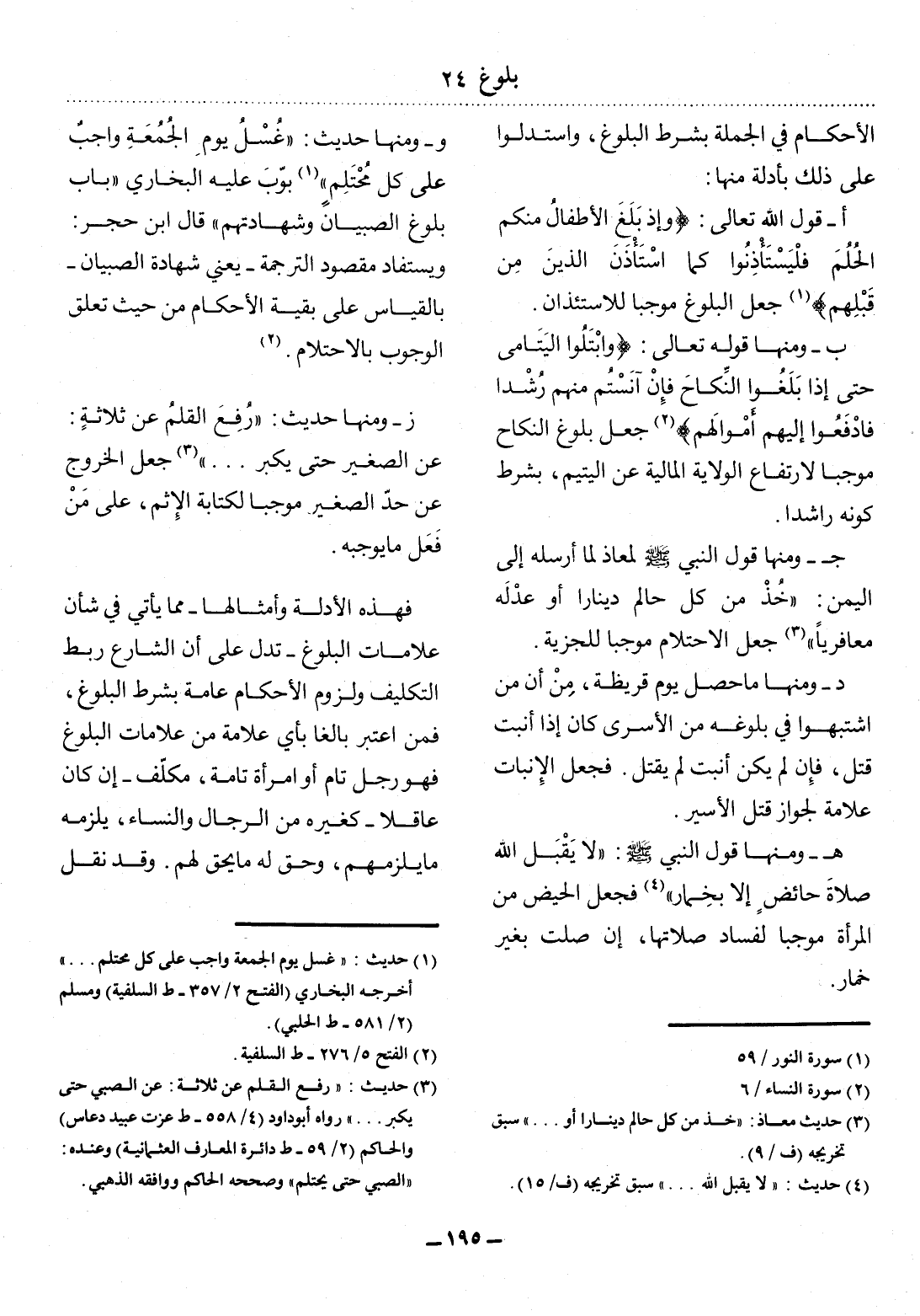 أ - قَوْل اللَّهِ تَعَالَى: {وَإِذَا بَلَغَ الأَْطْفَال مِنْكُمُ الْحُلُمَ فَلْيَسْتَأْذِنُوا كَمَا اسْتَأْذَنَ الَّذِينَ مِنْ قَبْلِهِمْ} (1) جَعَل الْبُلُوغَ مُوجِبًا لِلاِسْتِئْذَانِ.