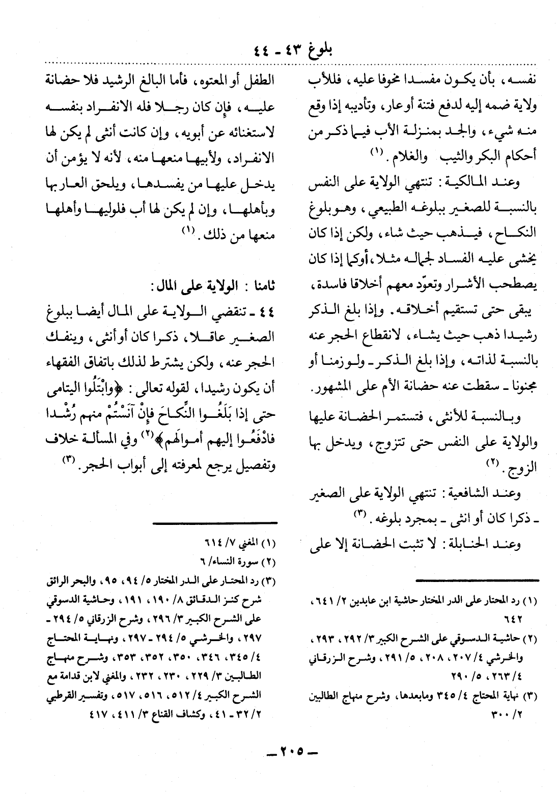 44 - تَنْقَضِي الْوِلاَيَةُ عَلَى الْمَال أَيْضًا بِبُلُوغِ الصَّغِيرِ عَاقِلاً، ذَكَرًا كَانَ أَوْ أُنْثَى، وَيَنْفَكُّ الْحَجْرُ عَنْهُ، وَلَكِنْ يُشْتَرَطُ لِذَلِكَ بِاتِّفَاقِ الْفُقَهَاءِ أَنْ يَكُونَ رَشِيدًا؛ لِقَوْلِهِ تَعَالَى: {وَابْتَلُوا الْيَتَامَى حَتَّى إِذَا بَلَغُوا النِّكَاحَ فَإِنْ آنَسْتُمْ مِنْهُمْ رُشْدًا فَادْفَعُوا إِلَيْهِمْ أَمْوَالَهُمْ} (2) وَفِي الْمَسْأَلَةِ خِلاَفٌ وَتَفْصِيلٌ يُرْجَعُ لِمَعْرِفَتِهِ إِلَى أَبْوَابِ الْحَجْرِ. (3)