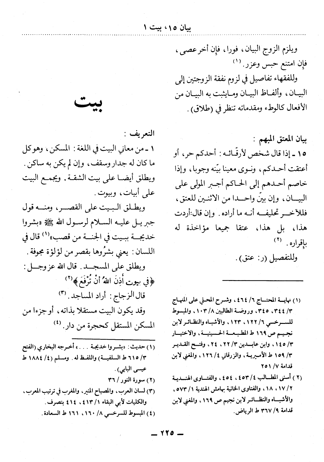 1 - مِنْ مَعَانِي الْبَيْتِ فِي اللُّغَةِ: الْمَسْكَنُ، وَهُوَ كُل مَا كَانَ لَهُ جِدَارٌ وَسَقْفٌ، وَإِنْ لَمْ يَكُنْ بِهِ سَاكِنٌ. وَيُطْلَقُ أَيْضًا عَلَى الْبَيْتِ الشُّقَّةُ. وَيُجْمَعُ الْبَيْتُ عَلَى أَبْيَاتٍ، وَبُيُوتٍ.