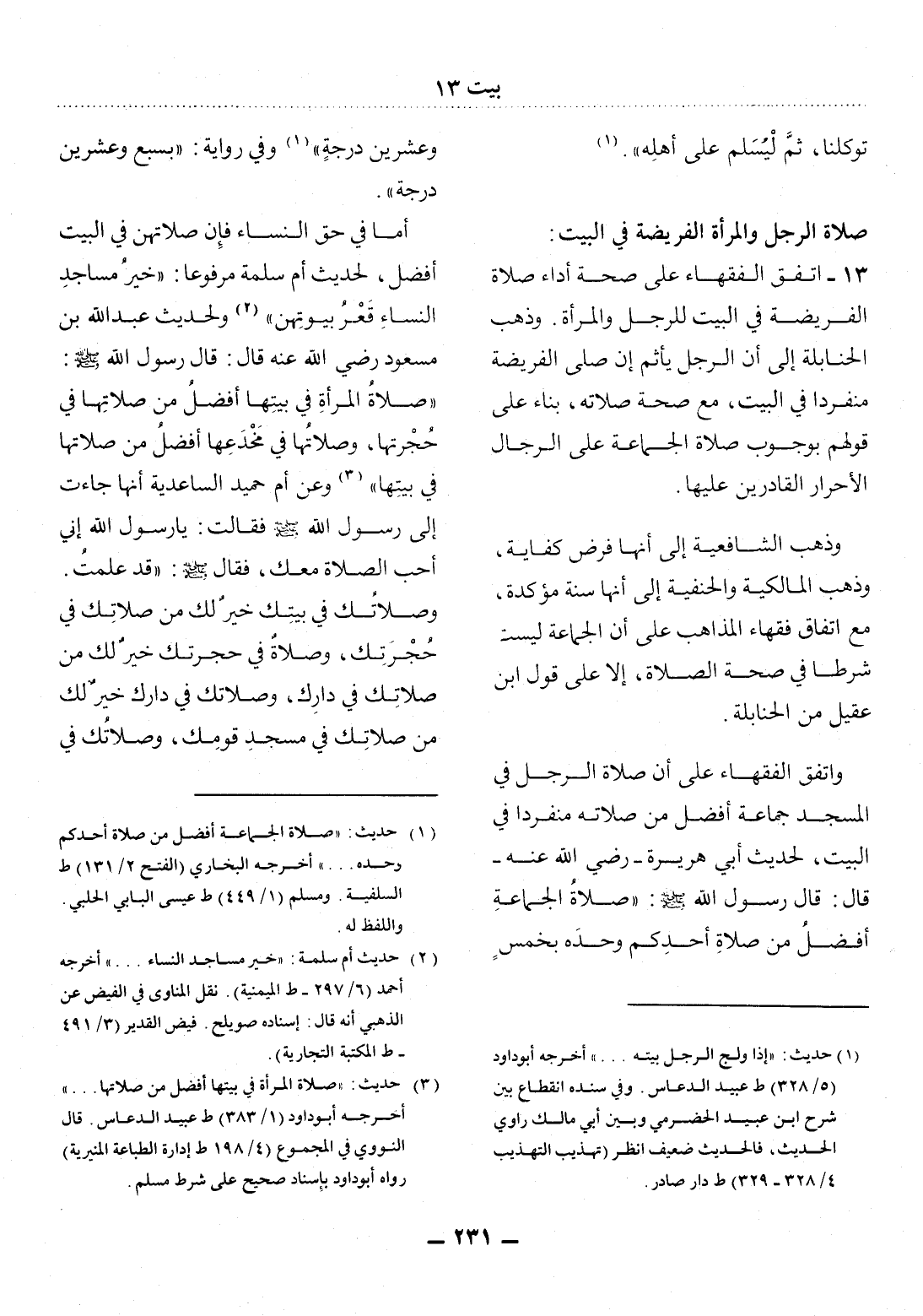 (3) حديث: " صلاة المرأة في بيتها أفضل من صلاتها. . " أخرجه أبو داود (1 / 383) ط عبيد الدعاس. قال النووي في المجموع (4 / 198 ط إدارة الطباعة المنيرية) رواه أبو داود بإسناد صحيح على شرط مسلم.