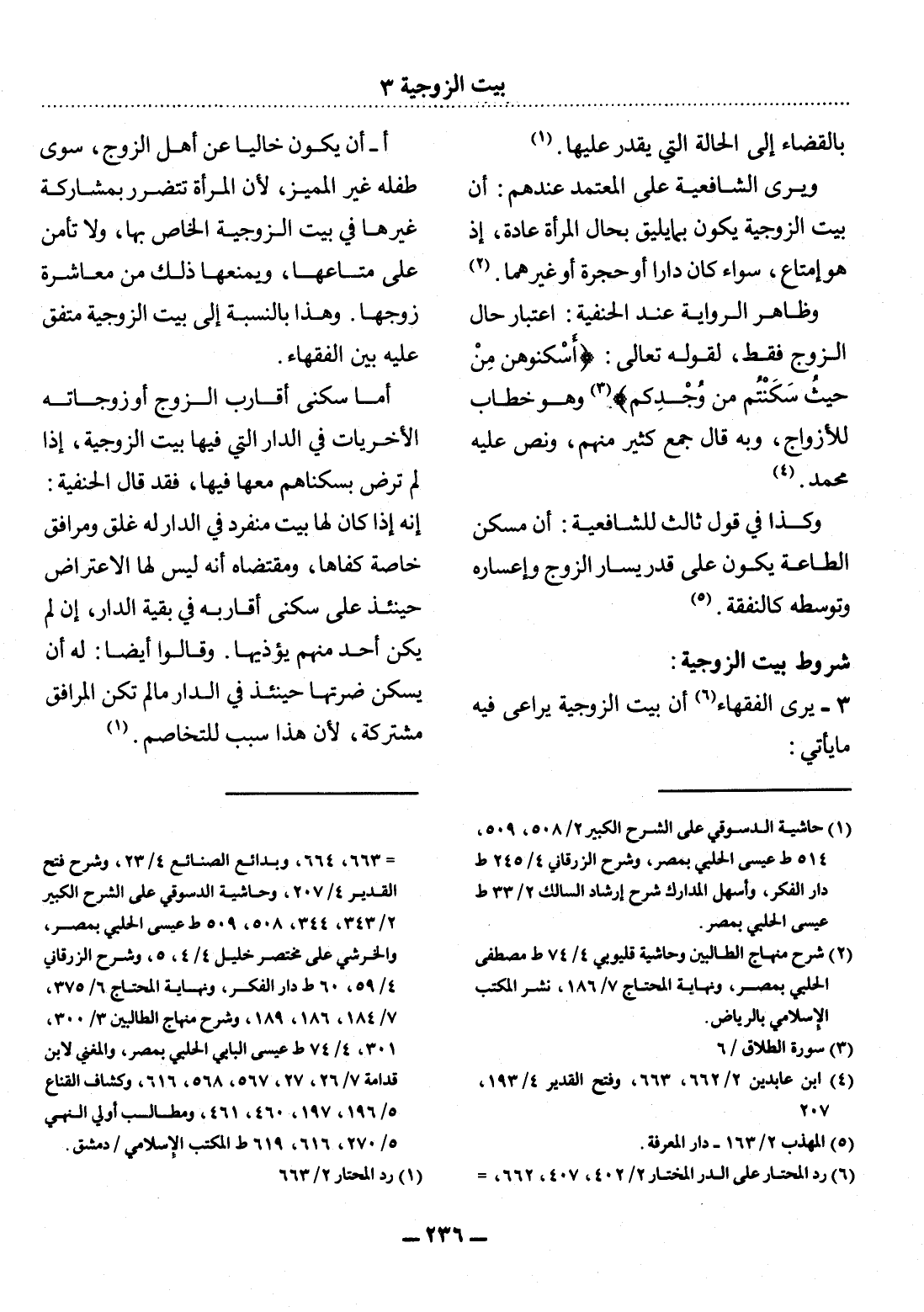 3 - يَرَى الْفُقَهَاءُ (6) أَنَّ بَيْتَ الزَّوْجِيَّةِ يُرَاعَى فِيهِ مَا يَأْتِي: