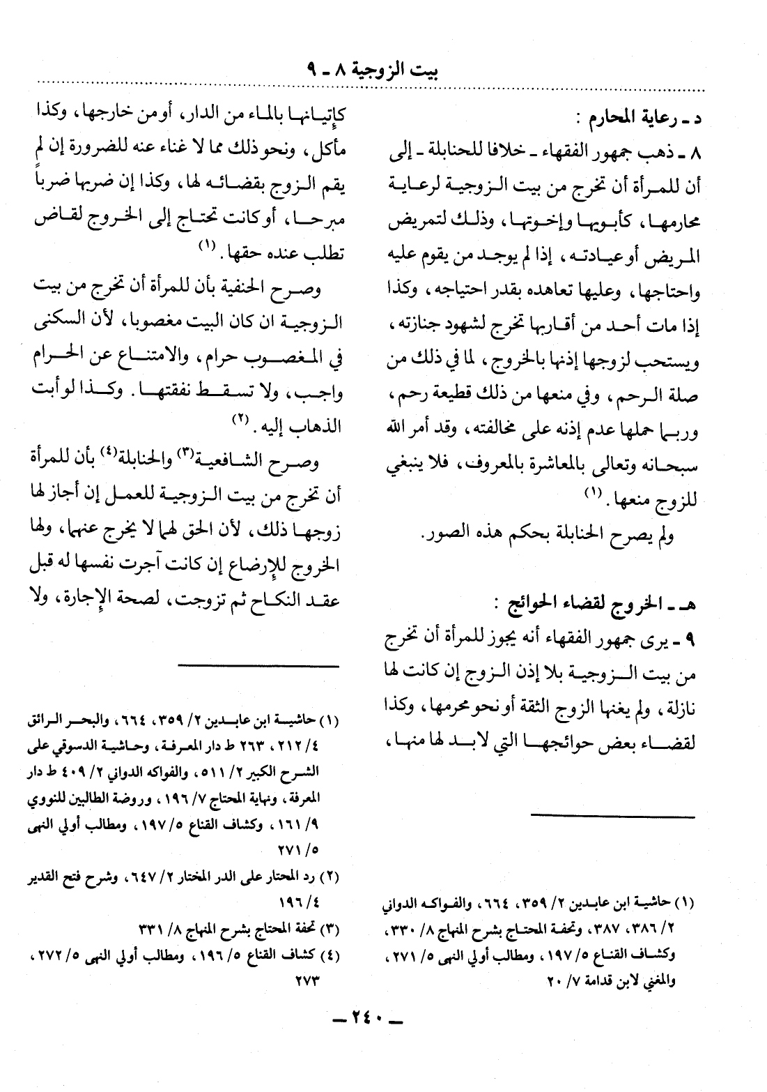 8 - ذَهَبَ جُمْهُورُ الْفُقَهَاءِ - خِلاَفًا لِلْحَنَابِلَةِ - إِلَى أَنَّ لِلْمَرْأَةِ أَنْ تَخْرُجَ مِنْ بَيْتِ الزَّوْجِيَّةِ لِرِعَايَةِ مَحَارِمِهَا، كَأَبَوَيْهَا وَإِخْوَتِهَا، وَذَلِكَ لِتَمْرِيضِ الْمَرِيضِ أَوْ عِيَادَتِهِ، إِذَا لَمْ يُوجَدْ مَنْ يَقُومُ عَلَيْهِ وَاحْتَاجَهَا، وَعَلَيْهَا تَعَاهُدُهُ بِقَدْرِ احْتِيَاجِهِ، وَكَذَا إِذَا مَاتَ أَحَدٌ مِنْ أَقَارِبِهَا تَخْرُجُ لِشُهُودِ جِنَازَتِهِ، وَيُسْتَحَبُّ لِزَوْجِهَا إِذْنُهَا بِالْخُرُوجِ؛ لِمَا فِي ذَلِكَ مِنْ صِلَةِ الرَّحِمِ، وَفِي مَنْعِهَا مِنْ ذَلِكَ قَطِيعَةُ رَحِمٍ، وَرُبَّمَا حَمَلَهَا عَدَمُ إِذْنِهِ عَلَى مُخَالَفَتِهِ، وَقَدْ أَمَرَ اللَّهُ سُبْحَانَهُ وَتَعَالَى بِالْمُعَاشَرَةِ بِالْمَعْرُوفِ، فَلاَ يَنْبَغِي لِلزَّوْجِ مَنْعُهَا (1) .