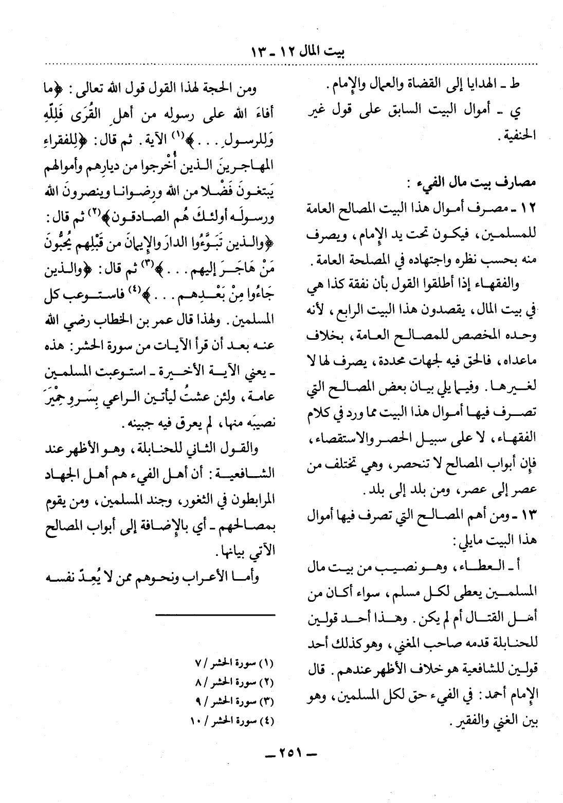 12 - مَصْرِفُ أَمْوَال هَذَا الْبَيْتِ الْمَصَالِحُ الْعَامَّةُ لِلْمُسْلِمِينَ، فَيَكُونُ تَحْتَ يَدِ الإِْمَامِ، وَيَصْرِفُ مِنْهُ بِحَسَبِ نَظَرِهِ وَاجْتِهَادِهِ فِي الْمَصْلَحَةِ الْعَامَّةِ.