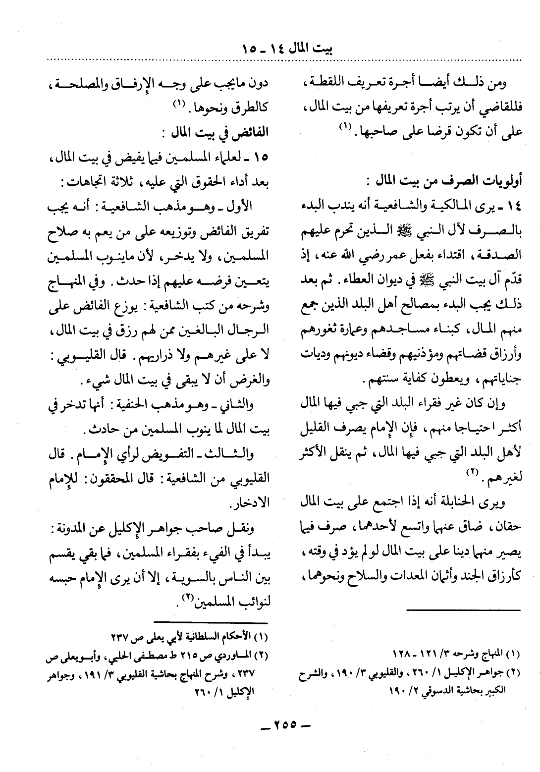 (2) الماوردي ص 215 ط مصطفى الحلبي، وأبو يعلى ص 237، وشرح المنهاج بحاشية القليوبي 3 / 191، وجواهر الإلكليل 1 / 260.