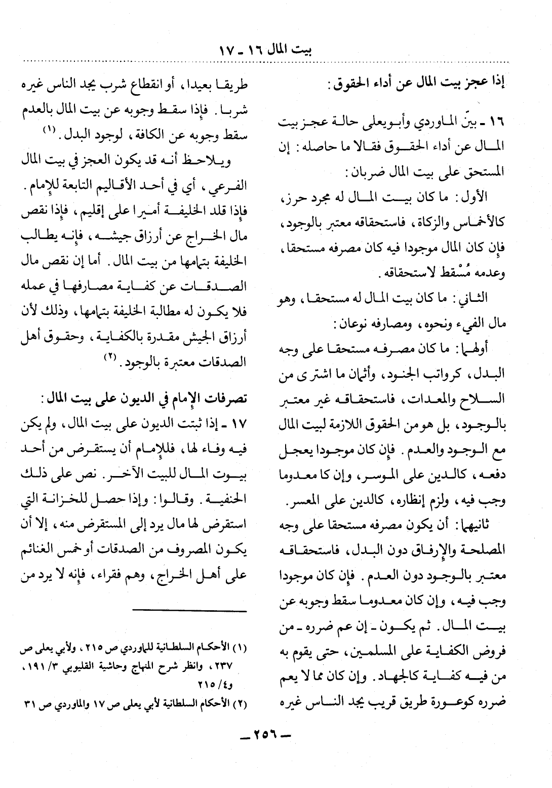 16 - بَيَّنَ الْمَاوَرْدِيُّ وَأَبُو يَعْلَى حَالَةَ عَجْزِ بَيْتِ الْمَال عَنْ أَدَاءِ الْحُقُوقِ فَقَالاَ مَا حَاصِلُهُ: إِنَّ الْمُسْتَحَقَّ عَلَى بَيْتِ الْمَال ضَرْبَانِ:
