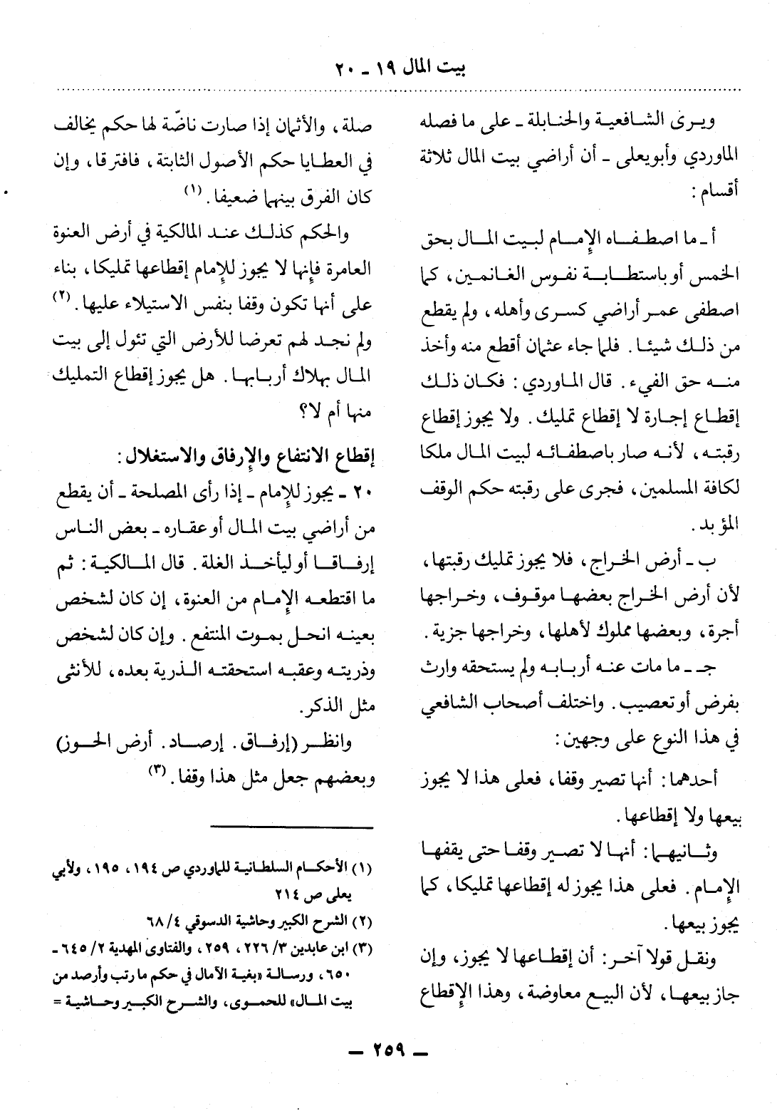 (3) ابن عابدين 3 / 226، 259، والفتاوى المهدية 2 / 645ـ 650، ورسالة " بغية الآمال في حكم ما رتب وأرصد من بيت المال " للحموي، والشرح الكبير وحاشية الدسوقي 4 / 68، وحاشية القليوبي على شرح المنهاج 3 / 92، والمغني 5 / 526، ونهاية المحتاج 5 / 337، 356، والأحكام السلطانية للماوردي ص 196، ولأبي يعلى ص 219.