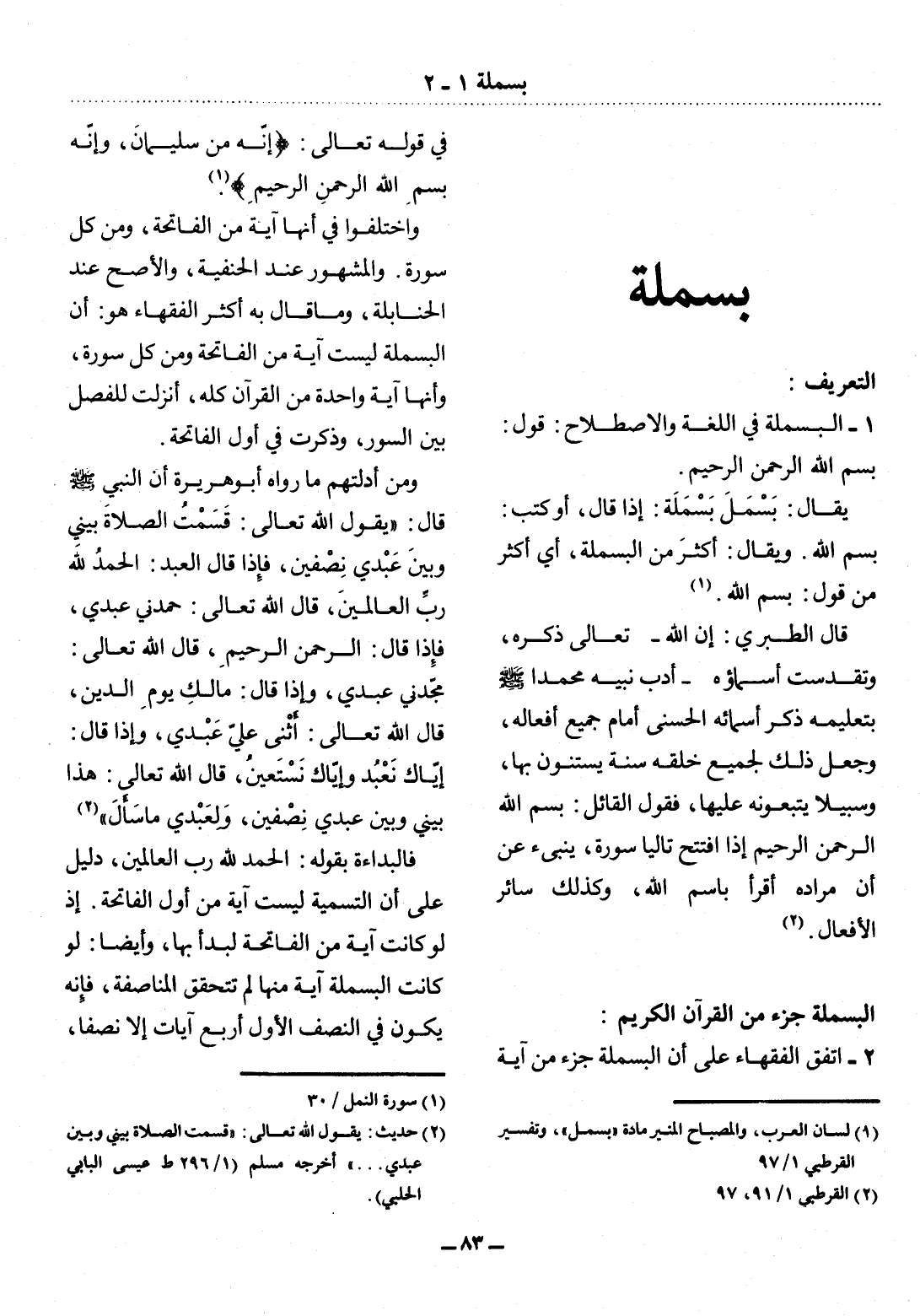 (1) لسان العرب، المصباح المنير مادة " بسمل "، وتفسير القرطبي 1 / 97.