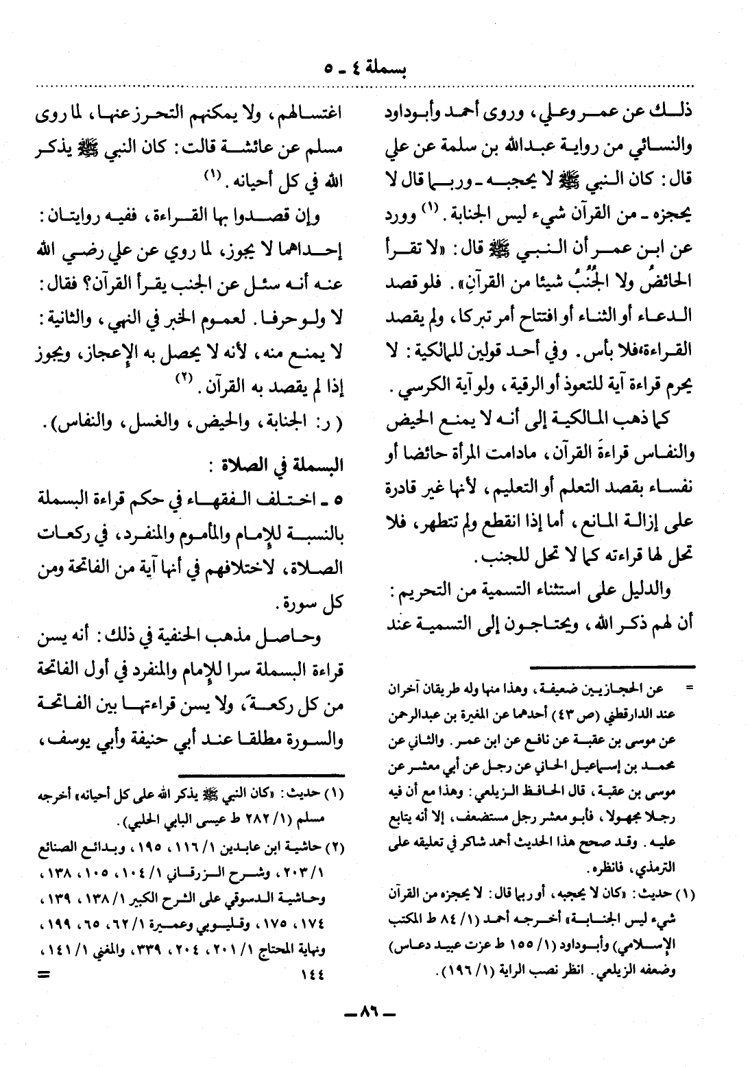 (1) حديث: " كان لا يحجبه، أو ربما قال: لا يحجزه من القرآن شيء ليس الجنابة " أخرجه أحمد (1 / 84 ط المكتب الإسلامي) وأبو داود (1 / 155 ط عزت عبيد دعاس) وضعفه الزيلعي. انظر نصب الراية (1 / 196)
