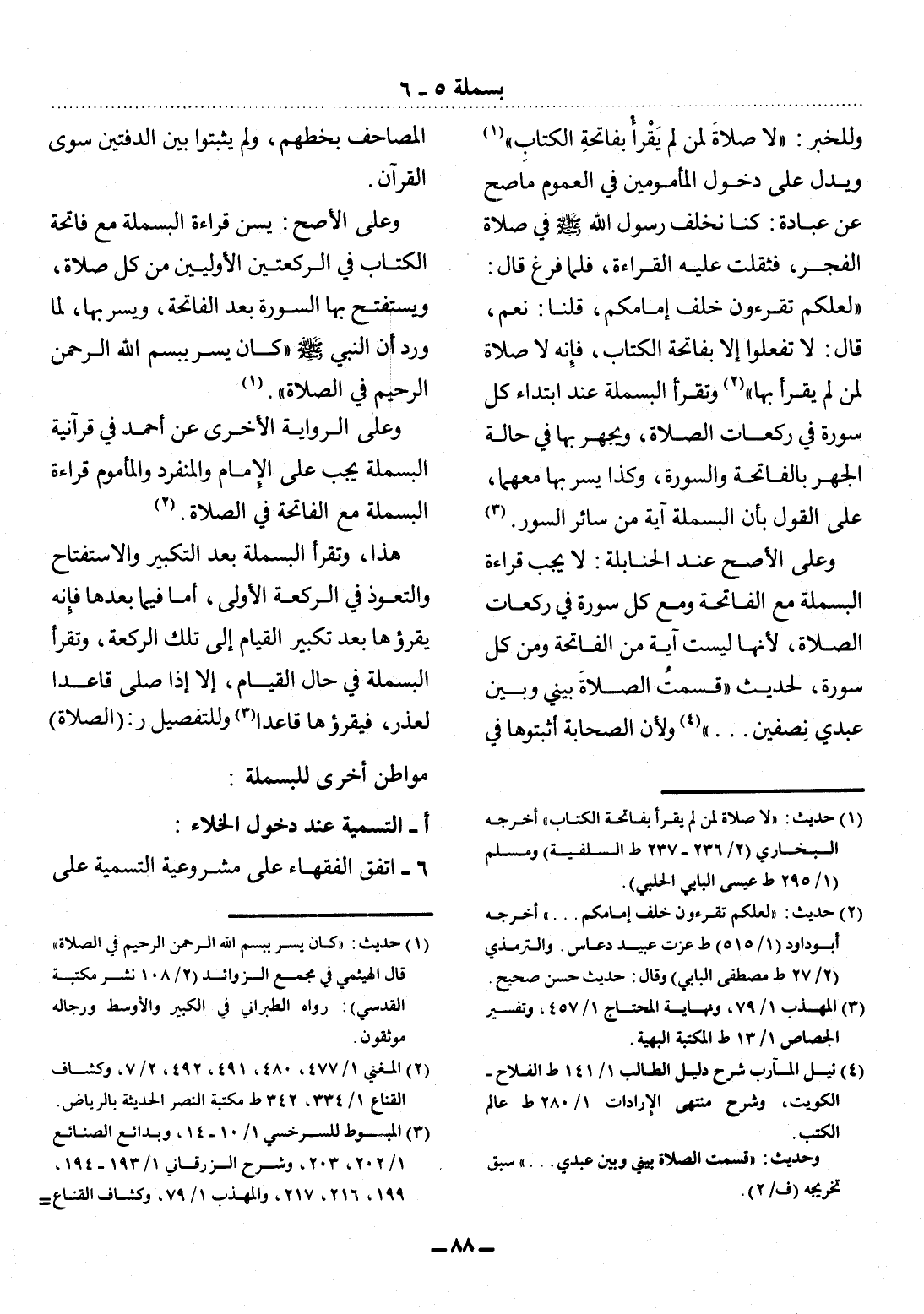 (4) نيل المآرب شرح دليل الطالب 1 / 141 ط الفلاح ـ الكويت، وشرح منتهى الإرادات 1 / 280 ط عالم الكتب. وحديث: " قسمت الصلاة بيني وبين عبدي. . . " سبق تخريجه (ف / 2) .