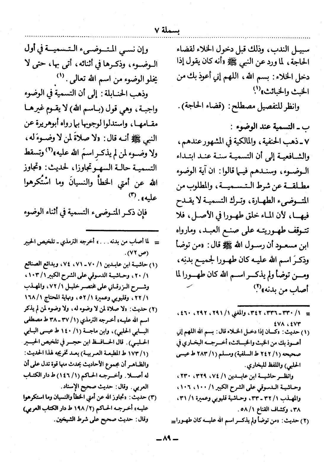 (1) حديث: " كان إذا دخل الخلاء قال: بسم الله اللهم إني أعوذ بالله من الخبث والخبائث " أخرجه البخاري في صحيحه (1 / 242 ط السلفية) ومسلم (1 / 283 ط عيسى الحلبي) واللفظ للبخاري. وانظر حاشية ابن عابدين 1 / 74، 329، 230، وحاشية الدسوقي على الشرح الكبير 1 / 100، 106، والمهذب 1 / 32 ـ 33، حاشية قليوبي وعميرة 1 / 31، 38، وكشاف القناع 1 / 58.