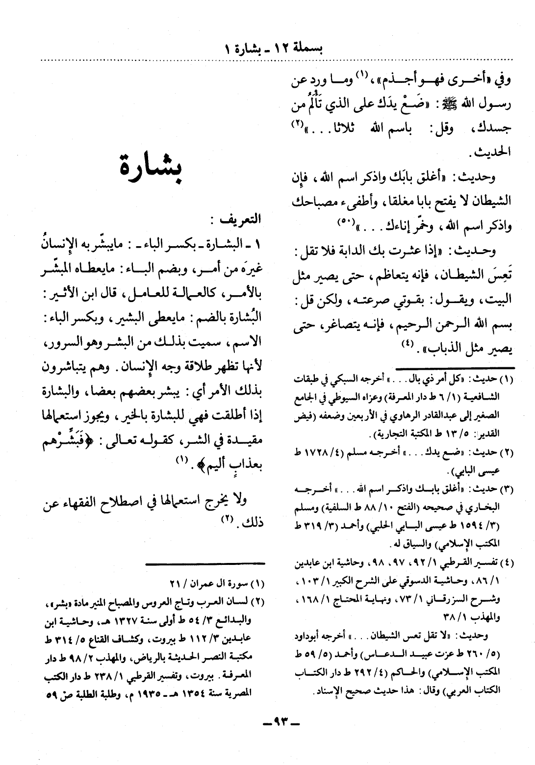 (2) لسان العرب وتاج العروس والمصباح المنير مادة " بشر "، والبدائع 3 / 54 ط أولى سنة 1327 هـ، وحاشية ابن عابدين 3 / 112 ط بيروت، وكشاف القناع 5 / 314 ط مكتبة النصر الحديثة بالرياض، والمهذب 2 / 98 ط دار المعرفة. بيروت، وتفسير القرطبي 1 / 238 ط دار الكتاب المصرية سنة 1354 هـ - 1935م، وطلبة الطلبة ص 59.