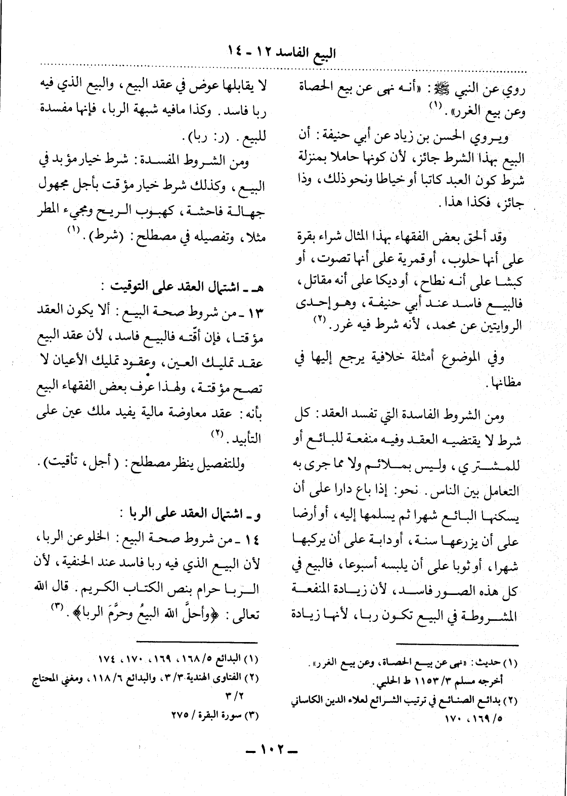 14 - مِنْ شُرُوطِ صِحَّةِ الْبَيْعِ: الْخُلُوُّ عَنِ الرِّبَا؛ لأَِنَّ الْبَيْعَ الَّذِي فِيهِ رِبًا فَاسِدٌ عِنْدَ الْحَنَفِيَّةِ؛ لأَِنَّ الرِّبَا حَرَامٌ بِنَصِّ الْكِتَابِ الْكَرِيمِ. قَال اللَّهُ تَعَالَى: {وَأَحَل اللَّهُ الْبَيْعَ وَحَرَّمَ الرِّبَا} (3) .