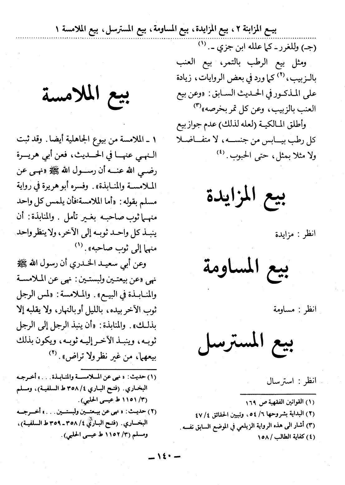 (1) حديث: " نهى عن الملامسة والمنابذة. . . " أخرجه البخاري. (فتح الباري 4 / 358 ط السلفية) ، ومسلم (3 / 1151 ط عيسى الحلبي) .