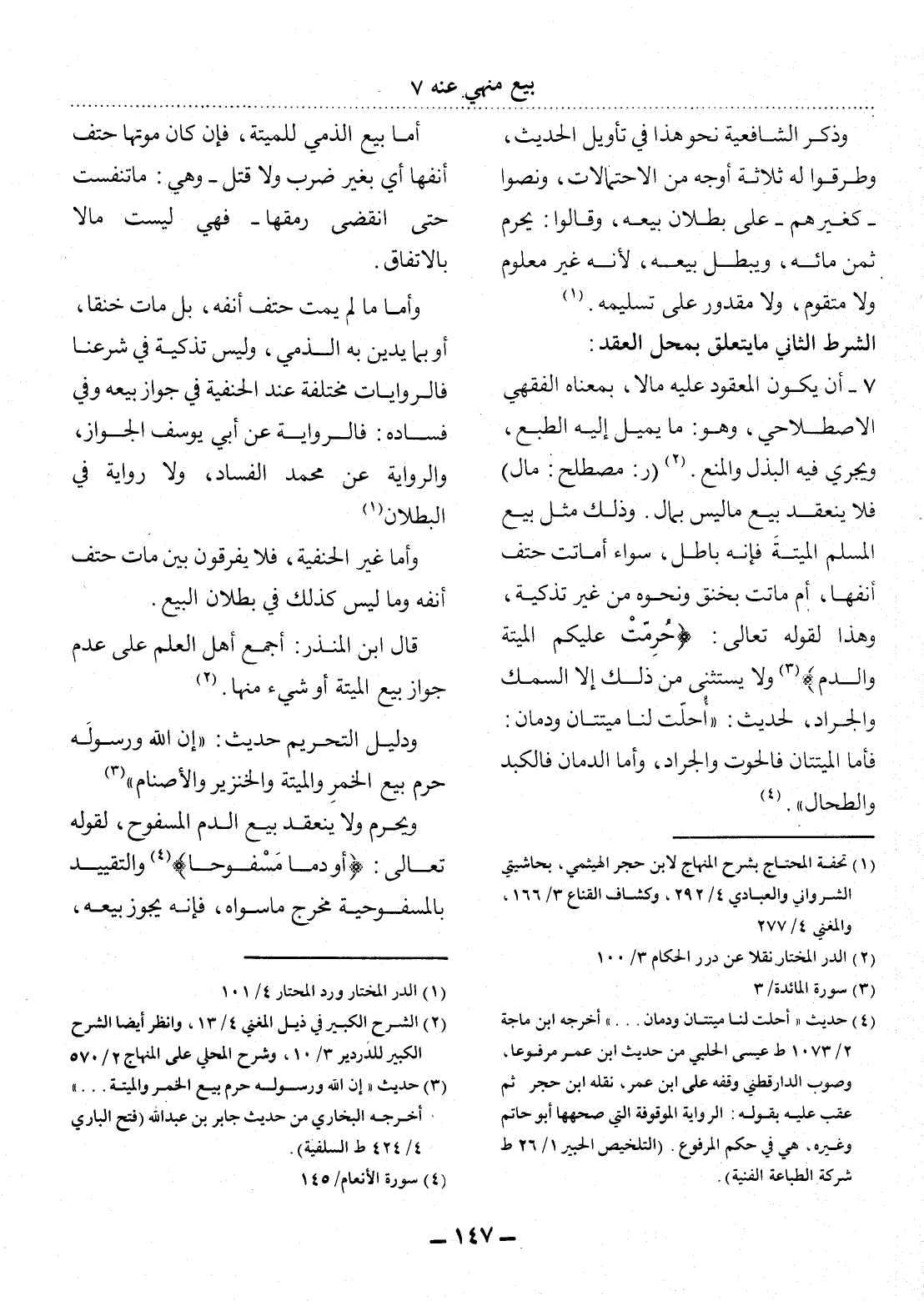 7 - أَنْ يَكُونَ الْمَعْقُودُ عَلَيْهِ مَالاً، بِمَعْنَاهُ الْفِقْهِيِّ الاِصْطِلاَحِيِّ، وَهُوَ: مَا يَمِيل إِلَيْهِ الطَّبْعُ، وَيَجْرِي فِيهِ الْبَذْل وَالْمَنْعُ (2) . (ر: مُصْطَلَحُ: مَال) فَلاَ يَنْعَقِدُ بَيْعُ مَا لَيْسَ بِمَالٍ. وَذَلِكَ مِثْل بَيْعِ الْمُسْلِمِ الْمَيْتَةَ فَإِنَّهُ بَاطِلٌ، سَوَاءٌ أَمَاتَتْ حَتْفَ أَنْفِهَا، أَمْ مَاتَتْ بِخَنْقٍ وَنَحْوِهِ مِنْ غَيْرِ تَذْكِيَةٍ، وَهَذَا لِقَوْلِهِ تَعَالَى: {حُرِّمَتْ عَلَيْكُمُ الْمَيْتَةُ وَالدَّمُ} (3) وَلاَ يُسْتَثْنَى مِنْ ذَلِكَ إِلاَّ السَّمَكُ وَالْجَرَادُ، لِحَدِيثِ: {أُحِلَّتْ لَنَا مَيْتَتَانِ وَدَمَانِ: فَأَمَّا الْمَيْتَتَانِ فَالْحُوتُ وَالْجَرَادُ، وَأَمَّا الدَّمَانِ فَالْكَبِدُ وَالطِّحَال} (4) .