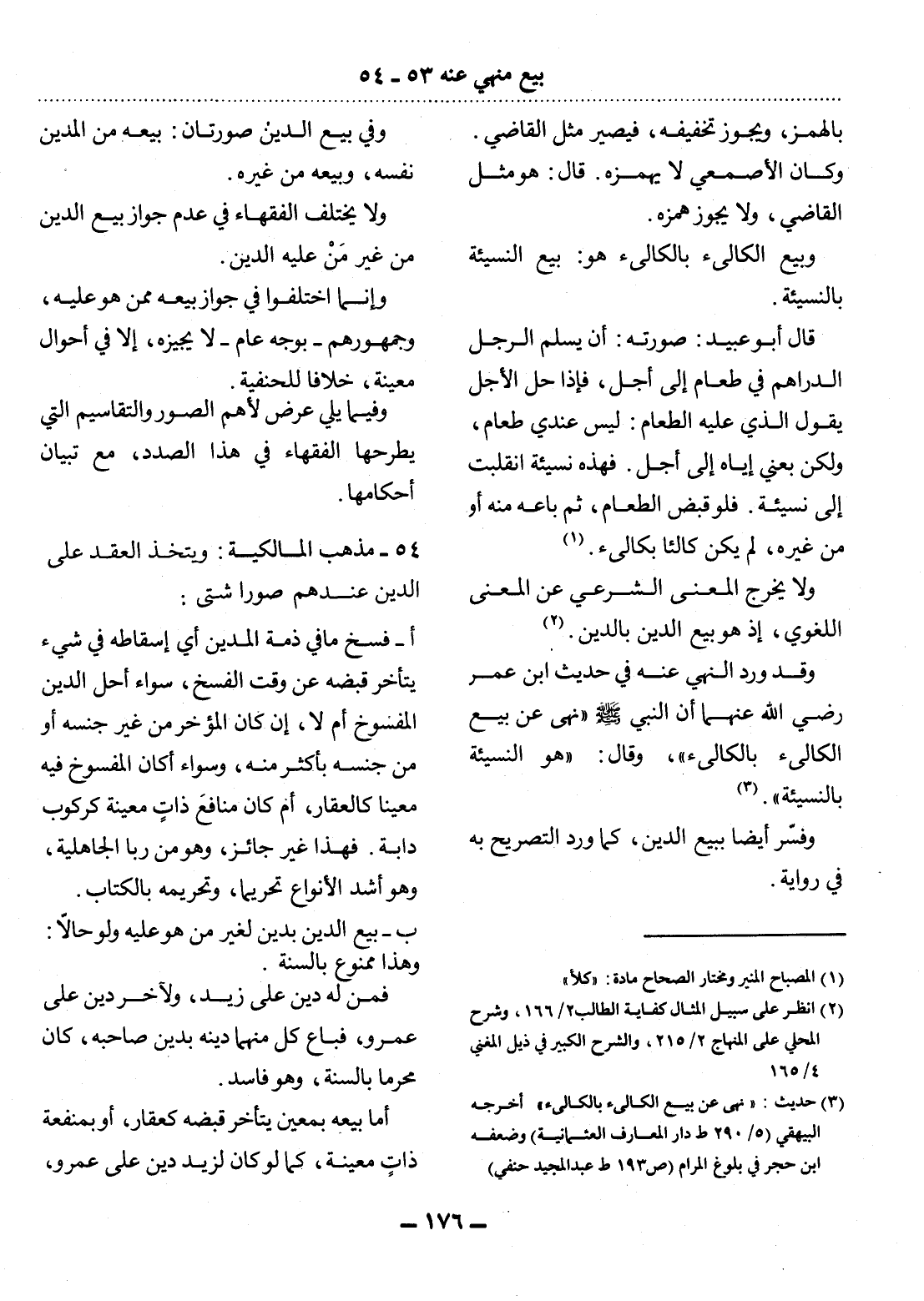 (3) حديث: " نهى عن بيع الكالئ بالكالئ " أخرجه البيهقي (5 / 290 ط دار المعارف العثمانية) وضعفه ابن حجر في بلوغ المرام (ص 193 ط عبد المجيد حنفي)