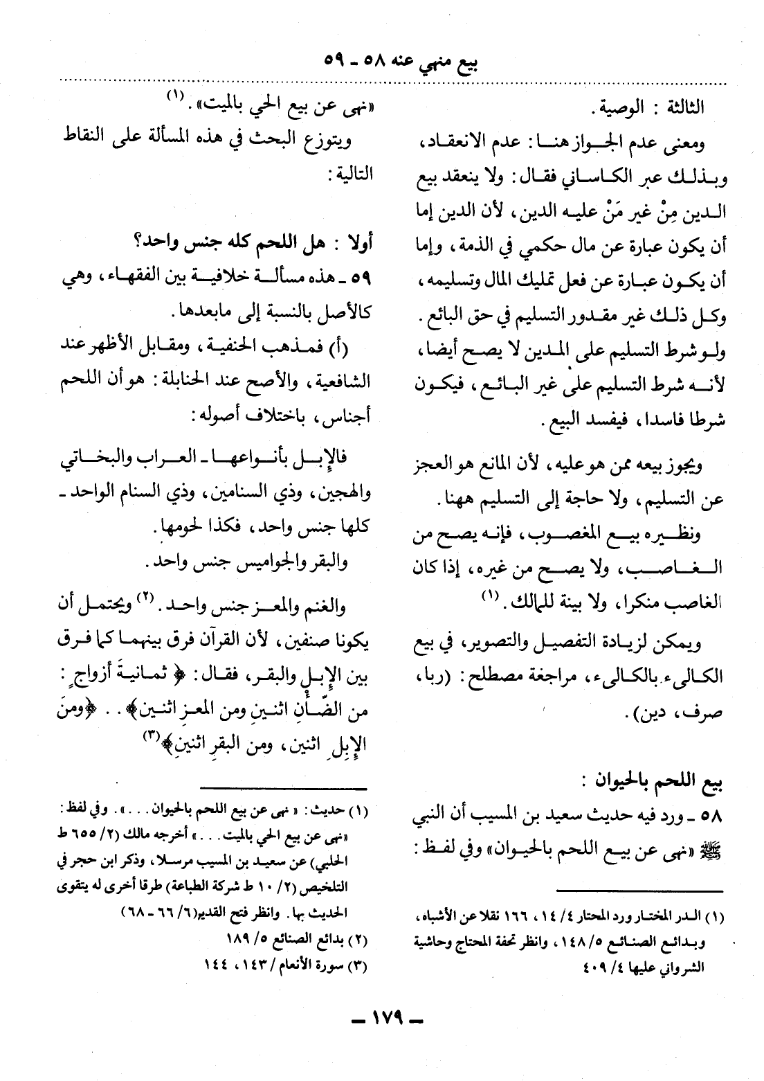 58 - وَرَدَ فِيهِ حَدِيثُ سَعِيدِ بْنِ الْمُسَيَّبِ أَنَّ النَّبِيَّ صَلَّى اللَّهُ عَلَيْهِ وَسَلَّمَ نَهَى عَنْ بَيْعِ اللَّحْمِ بِالْحَيَوَانِ وَفِي لَفْظٍ: