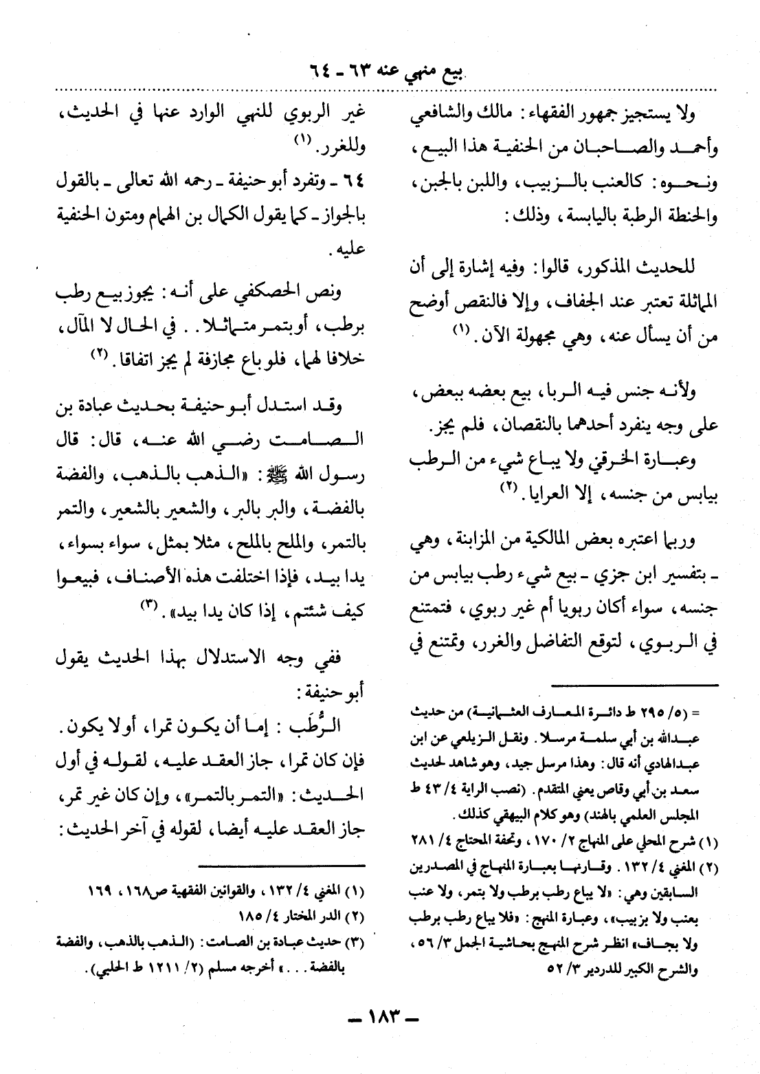 (2) المغني 4 / 132. وقارنها بعبارة المنهاج في المصدرين السابقين وهي: " لا يباع رطب برطب ولا بتمر، ولا عنب بعنب ولا بزبيب "، وعبارة المنهج: " فلا يباع رطب برطب ولا بجاف " انظر شرح المنهج بحاشية الجمل 3 / 56، والشرح الكبير للدردير 3 / 52