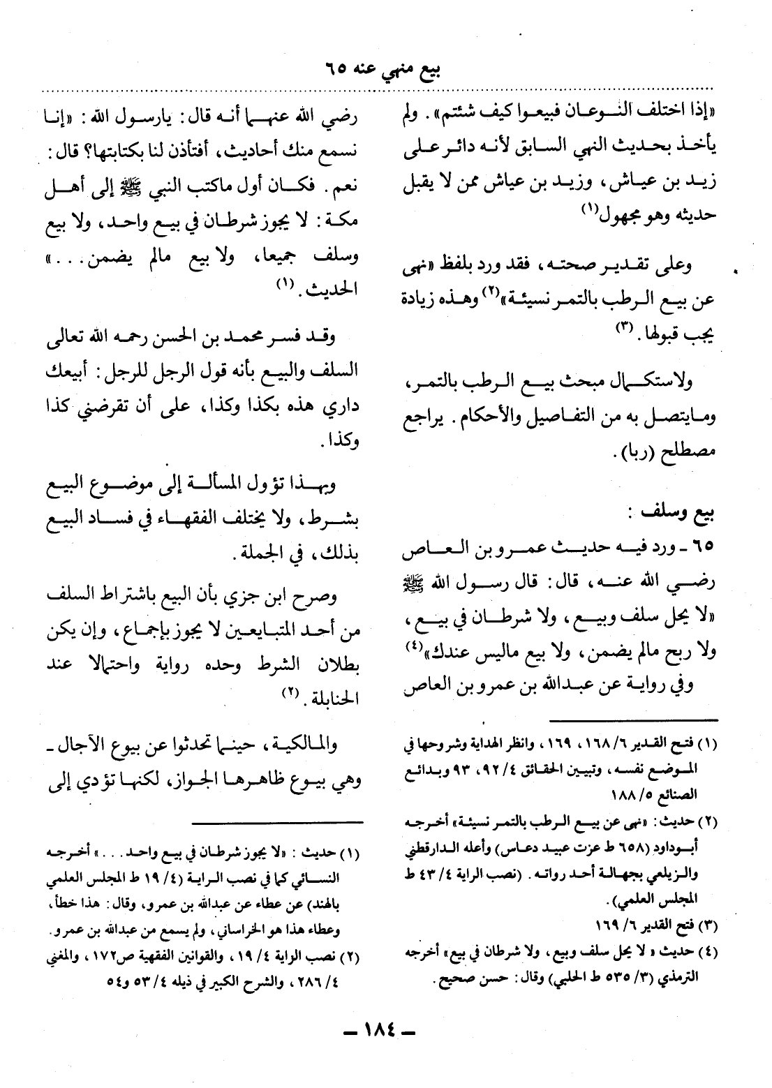 65 - وَرَدَ فِيهِ حَدِيثُ عَمْرِو بْنِ الْعَاصِ رَضِيَ اللَّهُ عَنْهُ، قَال: قَال رَسُول اللَّهِ صَلَّى اللَّهُ عَلَيْهِ وَسَلَّمَ لاَ يَحِل سَلَفٌ وَبَيْعٌ، وَلاَ شَرْطَانِ فِي بَيْعٍ، وَلاَ رِبْحُ مَا لَمْ يُضْمَنْ، وَلاَ بَيْعُ مَا لَيْسَ عِنْدَكَ (4) وَفِي رِوَايَةٍ عَنْ عَبْدِ اللَّهِ بْنِ عَمْرِو بْنِ الْعَاصِ رَضِيَ اللَّهُ عَنْهُمَا