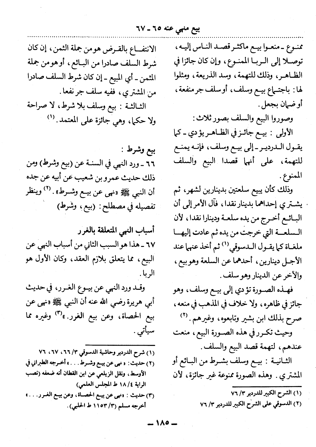 66 - وَرَدَ النَّهْيُ فِي السُّنَّةِ عَنْ (بَيْعٍ وَشَرْطٍ) وَمِنْ ذَلِكَ حَدِيثُ عَمْرِو بْنِ شُعَيْبٍ عَنْ أَبِيهِ عَنْ جَدِّهِ أَنَّ النَّبِيَّ صَلَّى اللَّهُ عَلَيْهِ وَسَلَّمَ نَهَى عَنْ بَيْعٍ وَشَرْطٍ (2) . وَيُنْظَرُ تَفْصِيلُهُ فِي مُصْطَلَحِ: (بَيْع، وَشَرْط)