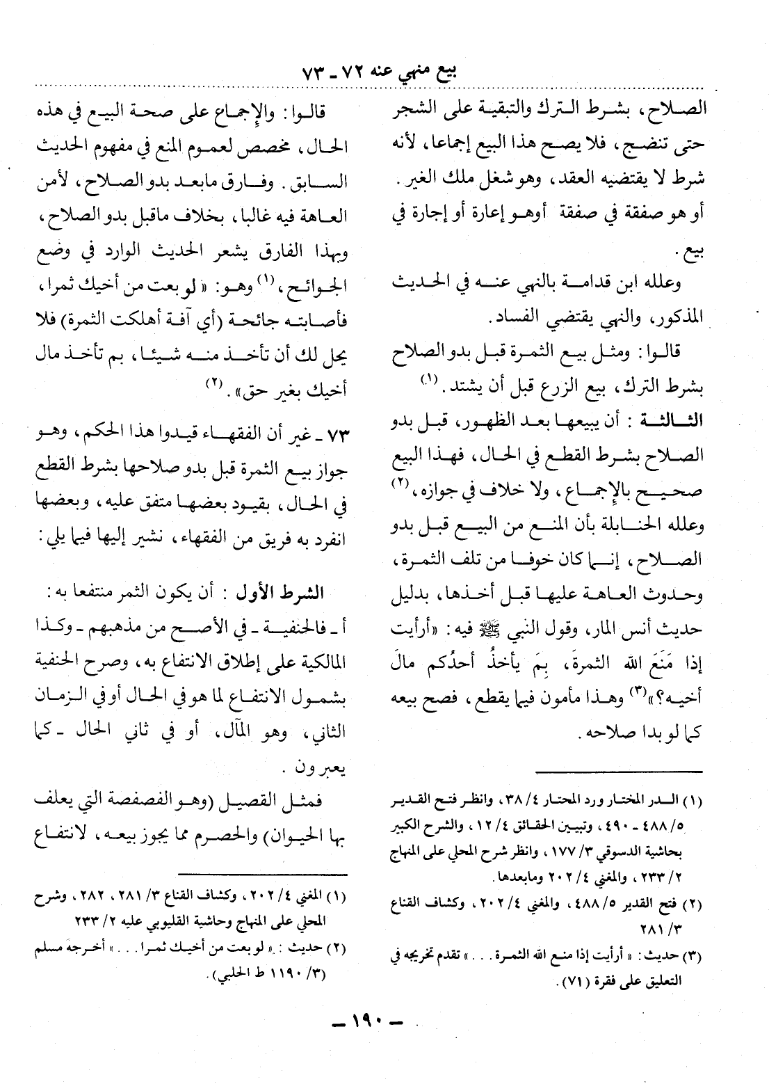 73 - غَيْرَ أَنَّ الْفُقَهَاءَ قَيَّدُوا هَذَا الْحُكْمَ، وَهُوَ جَوَازُ بَيْعِ الثَّمَرَةِ قَبْل بُدُوِّ صَلاَحِهَا بِشَرْطِ الْقَطْعِ فِي الْحَال، بِقُيُودٍ بَعْضُهَا مُتَّفَقٌ عَلَيْهِ، وَبَعْضُهَا انْفَرَدَ بِهِ فَرِيقٌ مِنَ الْفُقَهَاءِ، نُشِيرُ إِلَيْهَا فِيمَا يَلِي: الشَّرْطُ الأَْوَّل: أَنْ يَكُونَ الثَّمَرُ مُنْتَفَعًا بِهِ: