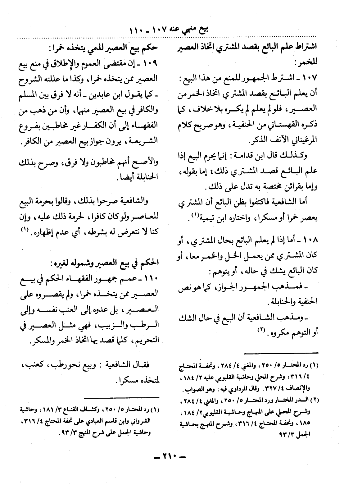 110 - عَمَّمَ جُمْهُورُ الْفُقَهَاءِ الْحُكْمَ فِي بَيْعِ الْعَصِيرِ مِمَّنْ يَتَّخِذُهُ خَمْرًا، وَلَمْ يُقْصِرُوهُ عَلَى الْعَصِيرِ، بَل عَدَّوْهُ إِلَى الْعِنَبِ نَفْسِهِ وَإِلَى الرُّطَبِ وَالزَّبِيبِ، فَهِيَ مِثْل الْعَصِيرِ فِي التَّحْرِيمِ، كُلَّمَا قُصِدَ بِهَا اتِّخَاذُ الْخَمْرِ وَالْمُسْكِرِ.