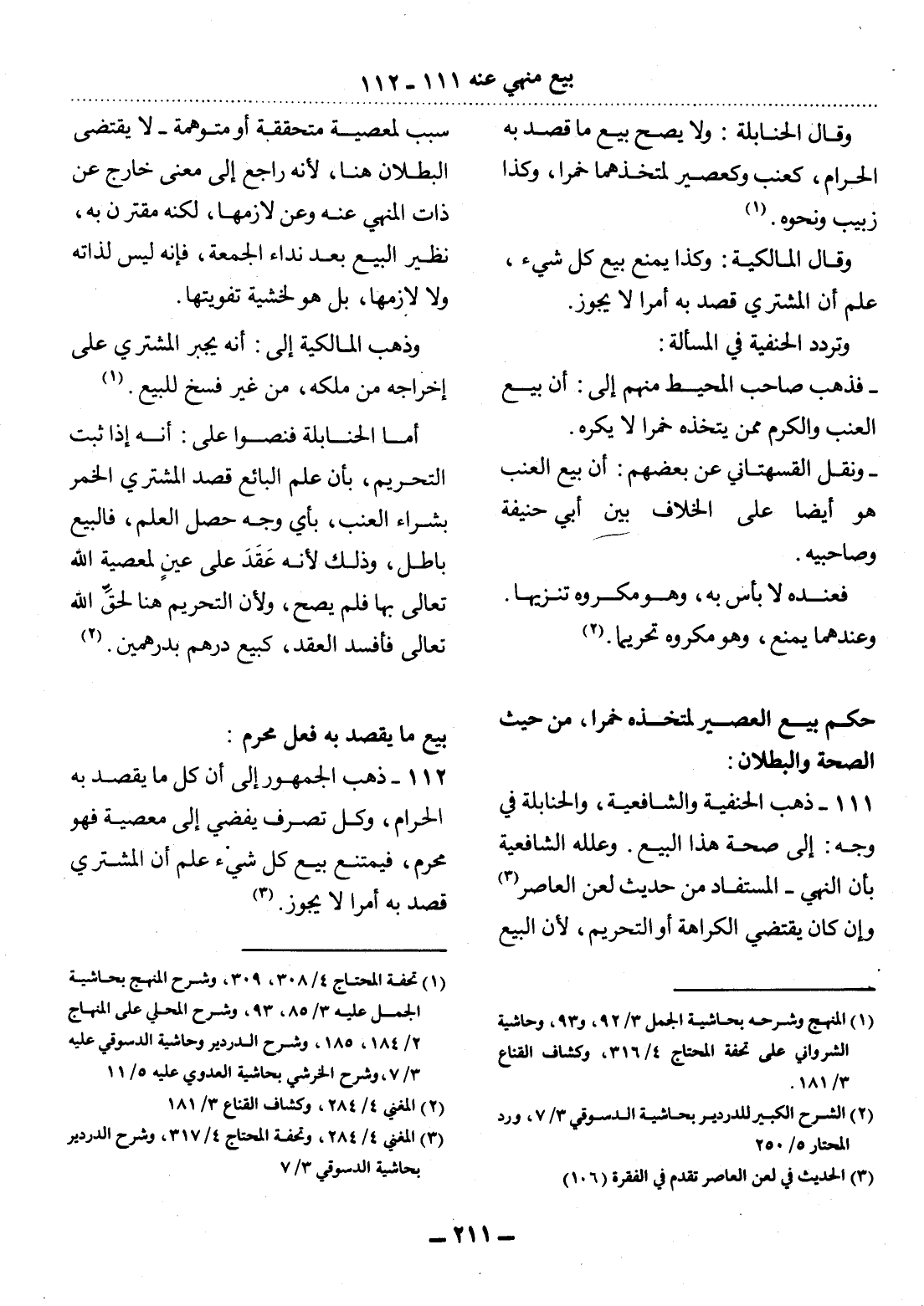 112 - ذَهَبَ الْجُمْهُورُ إِلَى أَنَّ كُل مَا يُقْصَدُ بِهِ الْحَرَامُ، وَكُل تَصَرُّفٍ يُفْضِي إِلَى مَعْصِيَةٍ فَهُوَ مُحَرَّمٌ، فَيَمْتَنِعُ بَيْعُ كُل شَيْءٍ عُلِمَ أَنَّ الْمُشْتَرِيَ قَصَدَ بِهِ أَمْرًا لاَ يَجُوزُ (3) .