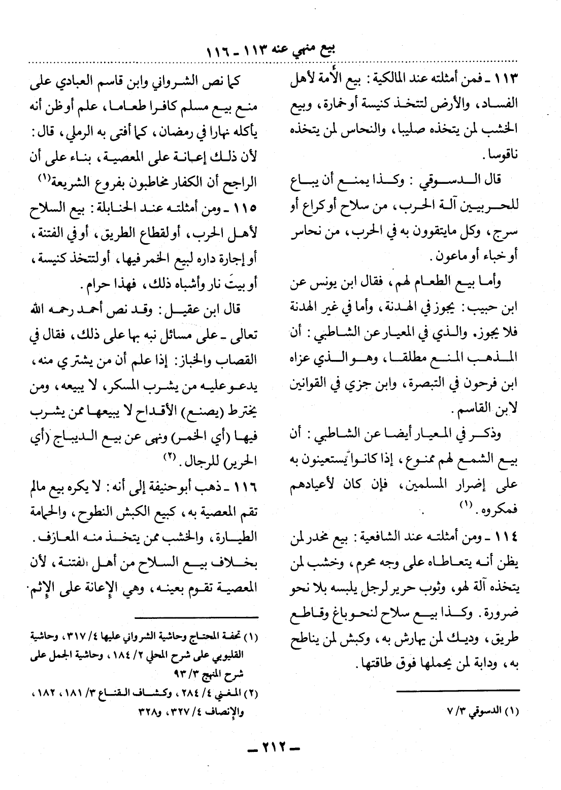 113 - فَمِنْ أَمْثِلَتِهِ عِنْدَ الْمَالِكِيَّةِ: بَيْعُ الأَْمَةِ لأَِهْل الْفَسَادِ، وَالأَْرْضِ لِتُتَّخَذَ كَنِيسَةً أَوْ خَمَّارَةً، وَبَيْعُ الْخَشَبِ لِمَنْ يَتَّخِذُهُ صَلِيبًا، وَالنُّحَاسُ لِمَنْ يَتَّخِذُهُ نَاقُوسًا.