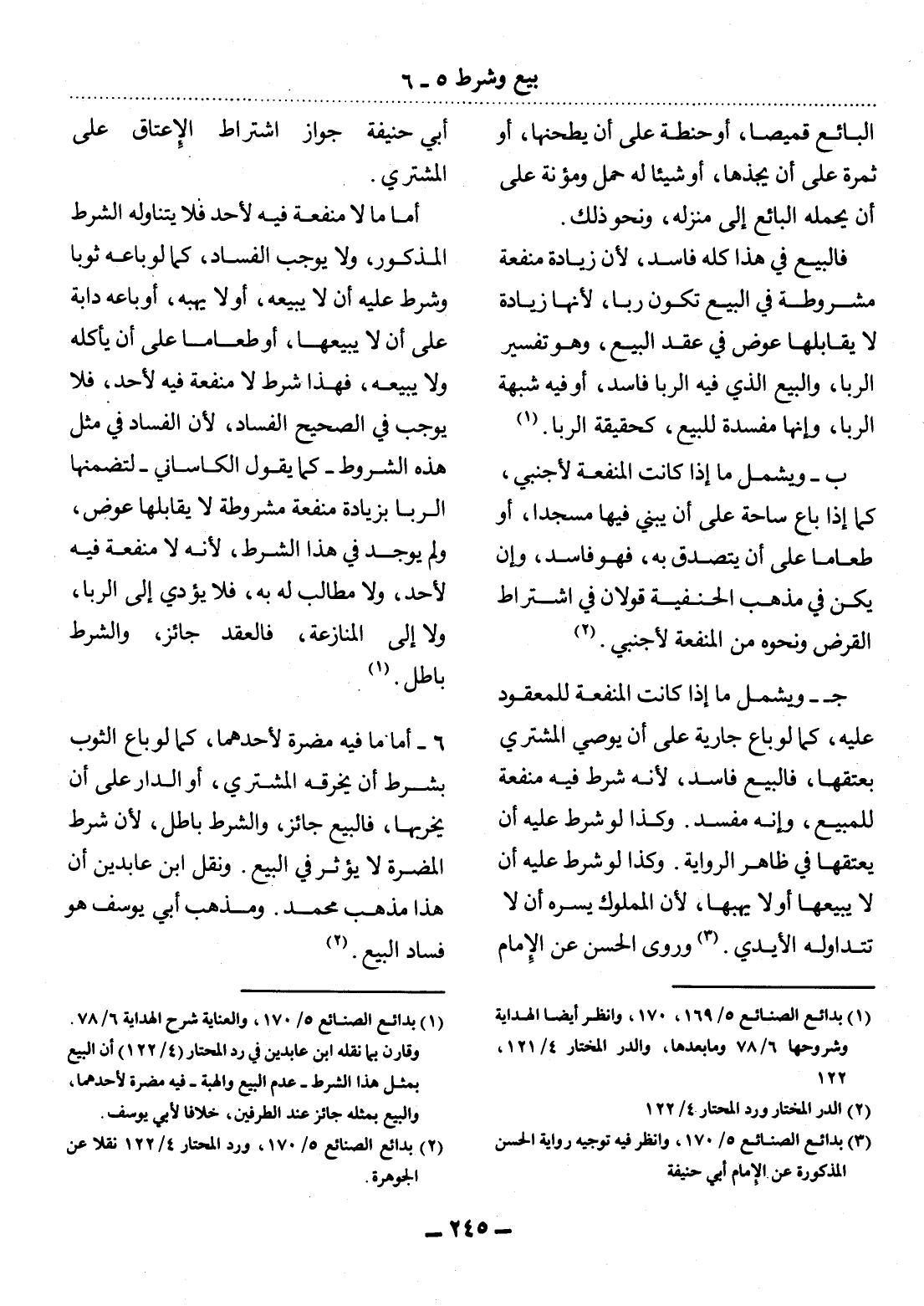 (1) بدائع الصنائع 5 / 170، والعناية شرح الهداية 6 / 78. وقارن بما نقله ابن عابدين في رد المحتار (4 / 122) أن البيع بمثل هذا الشرط - عدم البيع والهبة - فيه مضرة لأحدهما، والبيع بمثله جائز عند الطرفين، خلافا لأبي يوسف.