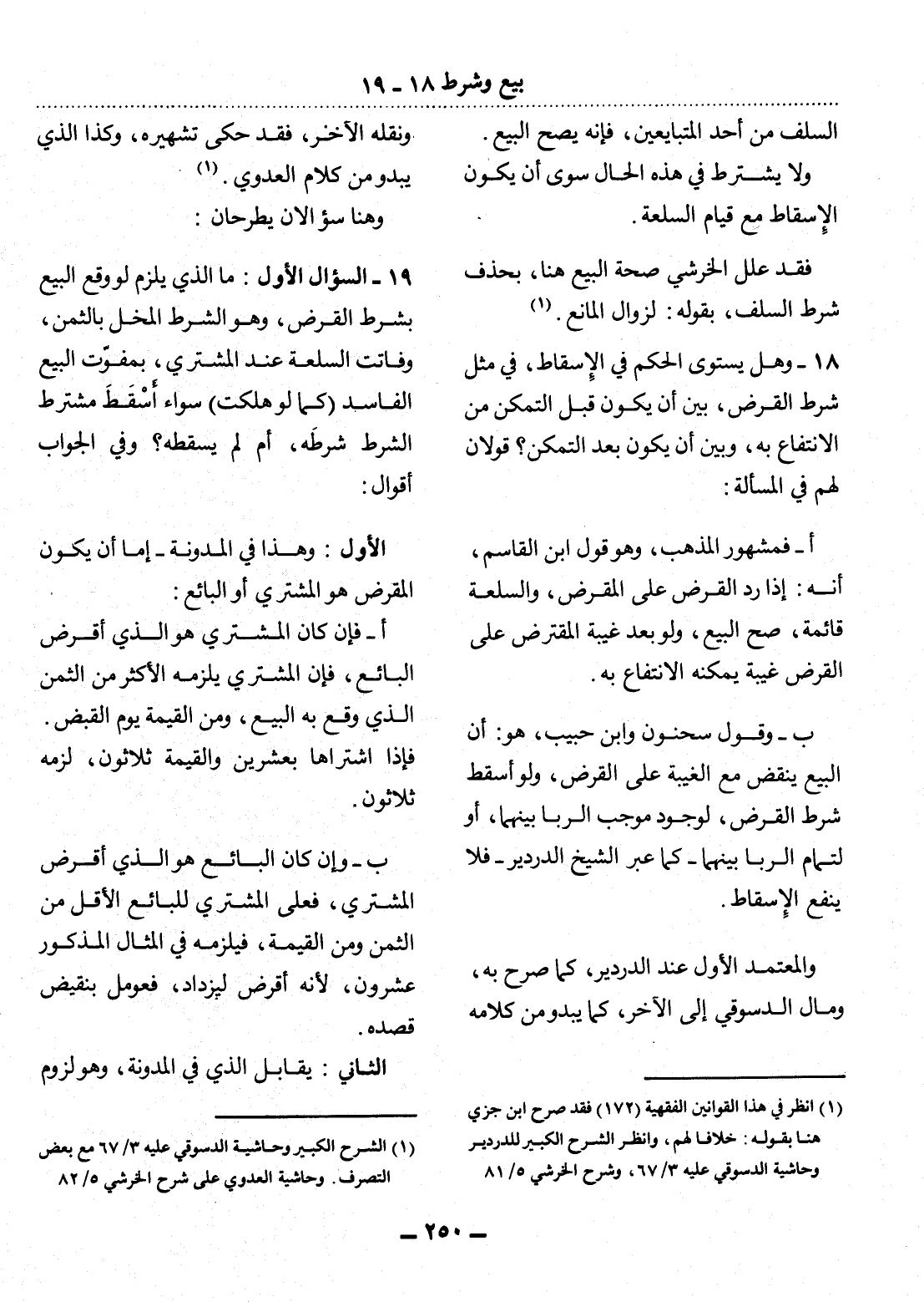 19 - السُّؤَال الأَْوَّل: مَا الَّذِي يَلْزَمُ لَوْ وَقَعَ الْبَيْعُ بِشَرْطِ الْقَرْضِ، وَهُوَ الشَّرْطُ الْمُخِل بِالثَّمَنِ، وَفَاتَتِ السِّلْعَةُ عِنْدَ الْمُشْتَرِي، بِمُفَوِّتِ الْبَيْعِ الْفَاسِدِ (كَمَا لَوْ هَلَكَتْ) سَوَاءٌ أَسْقَطَ مُشْتَرِطُ الشَّرْطِ شَرْطَهُ، أَمْ لَمْ يُسْقِطْهُ؟ وَفِي الْجَوَابِ أَقْوَالٌ: