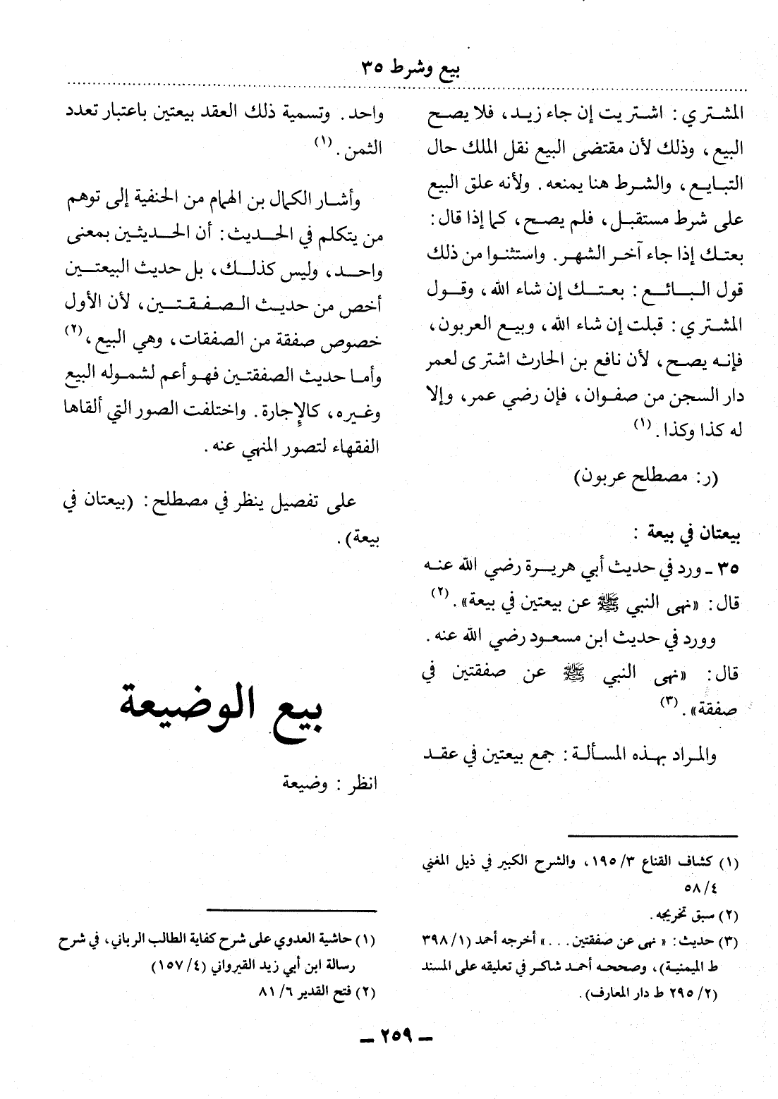 35 - وَرَدَ فِي حَدِيثِ أَبِي هُرَيْرَةَ رَضِيَ اللَّهُ عَنْهُ قَال: نَهَى النَّبِيُّ صَلَّى اللَّهُ عَلَيْهِ وَسَلَّمَ عَنْ بَيْعَتَيْنِ فِي بَيْعَةٍ. (2)