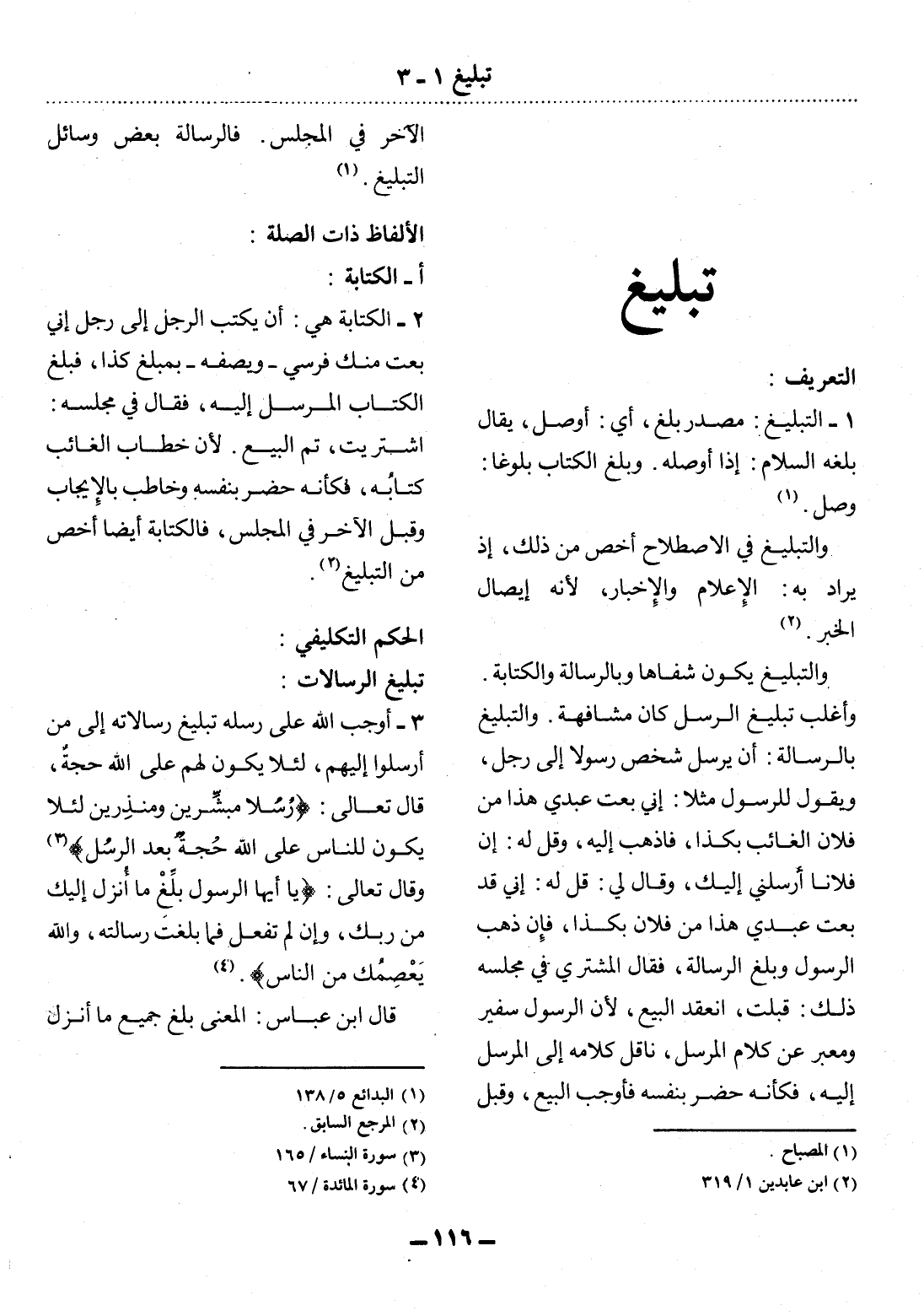 1 - التَّبْلِيغُ: مَصْدَرُ بَلَّغَ، أَيْ: أَوْصَل، يُقَال: بَلَّغَهُ السَّلاَمَ: إِذَا أَوْصَلَهُ. وَبَلَغَ الْكِتَابُ بُلُوغًا: وَصَل. (1)