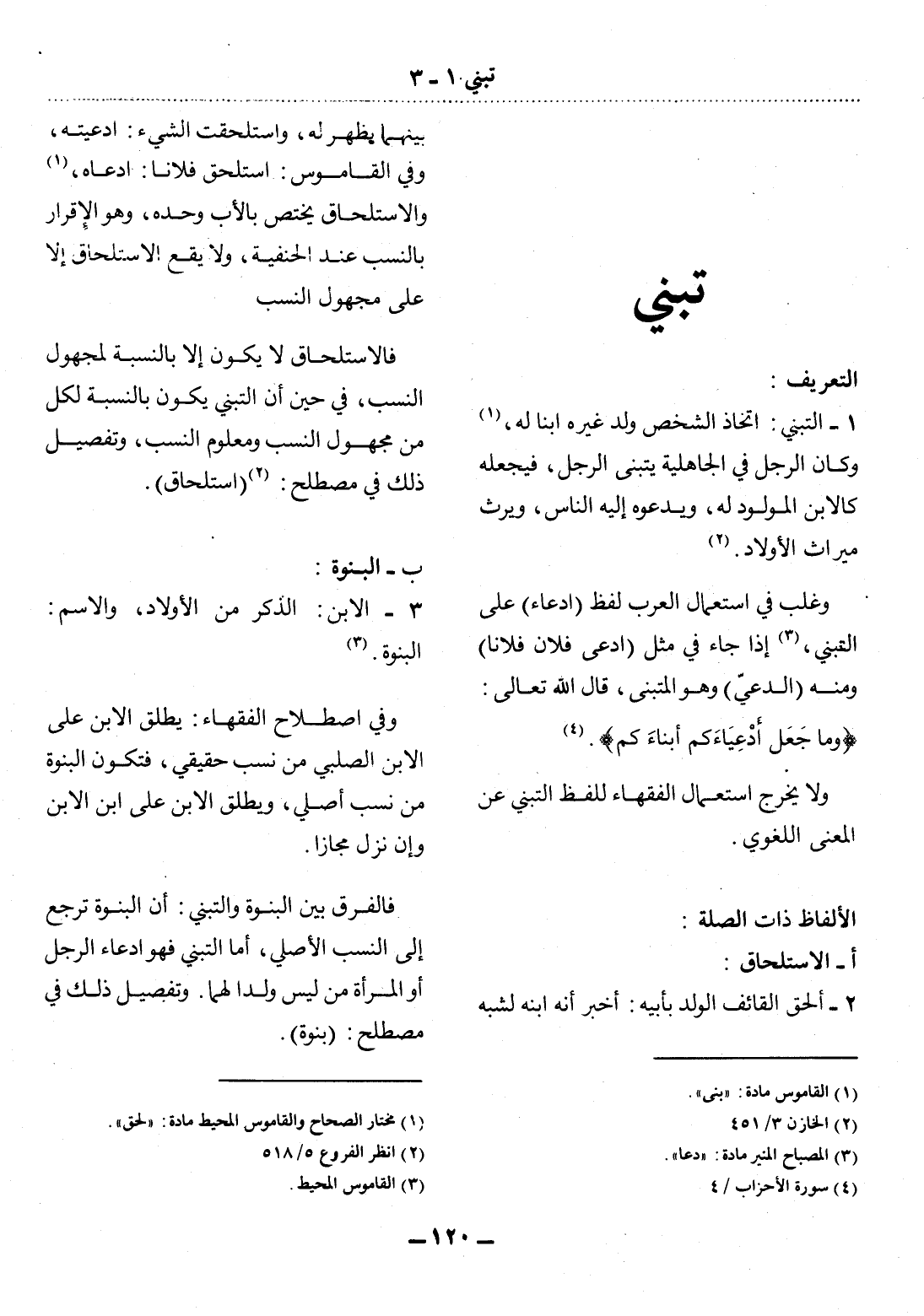 1 - التَّبَنِّي: اتِّخَاذُ الشَّخْصِ وَلَدَ غَيْرِهِ ابْنًا لَهُ، (1) وَكَانَ الرَّجُل فِي الْجَاهِلِيَّةِ يَتَبَنَّى الرَّجُل، فَيَجْعَلُهُ كَالاِبْنِ الْمَوْلُودِ لَهُ، وَيَدْعُوهُ إِلَيْهِ النَّاسُ، وَيَرِثُ مِيرَاثَ الأَْوْلاَدِ. (2)