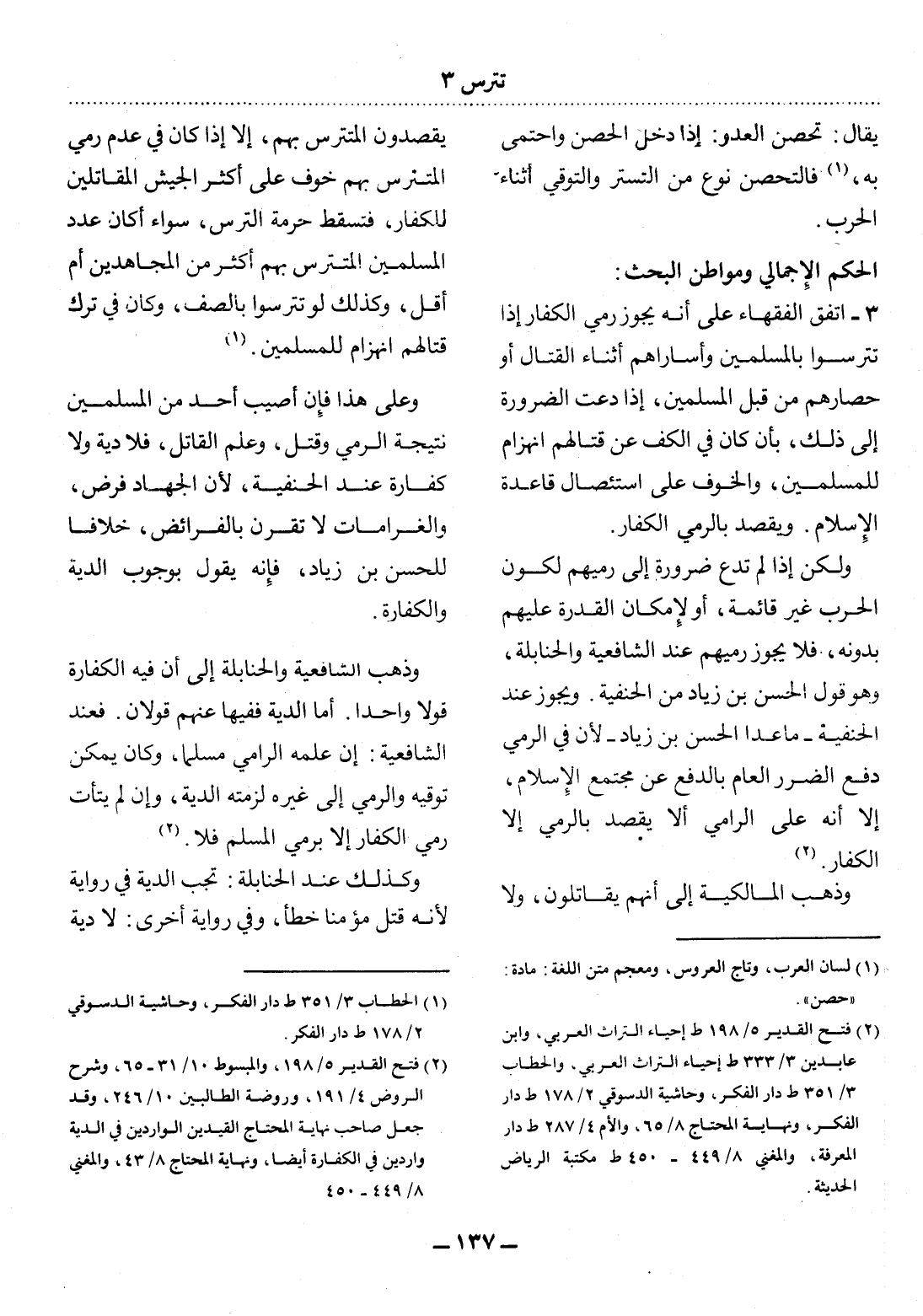 يَقْصِدُونَ الْمُتَتَرَّسَ بِهِمْ، إِلاَّ إِذَا كَانَ فِي عَدَمِ رَمْيِ الْمُتَتَرَّسِ بِهِمْ خَوْفٌ عَلَى أَكْثَرِ الْجَيْشِ الْمُقَاتِلِينَ لِلْكُفَّارِ، فَتَسْقُطُ حُرْمَةُ التُّرْسِ، سَوَاءٌ أَكَانَ عَدَدُ الْمُسْلِمِينَ الْمُتَتَرَّسِ بِهِمْ أَكْثَرَ مِنَ الْمُجَاهِدِينَ أَمْ أَقَل، وَكَذَلِكَ لَوْ تَتَرَّسُوا بِالصَّفِّ، وَكَانَ فِي تَرْكِ قِتَالِهِمُ انْهِزَامٌ لِلْمُسْلِمِينَ. (1)