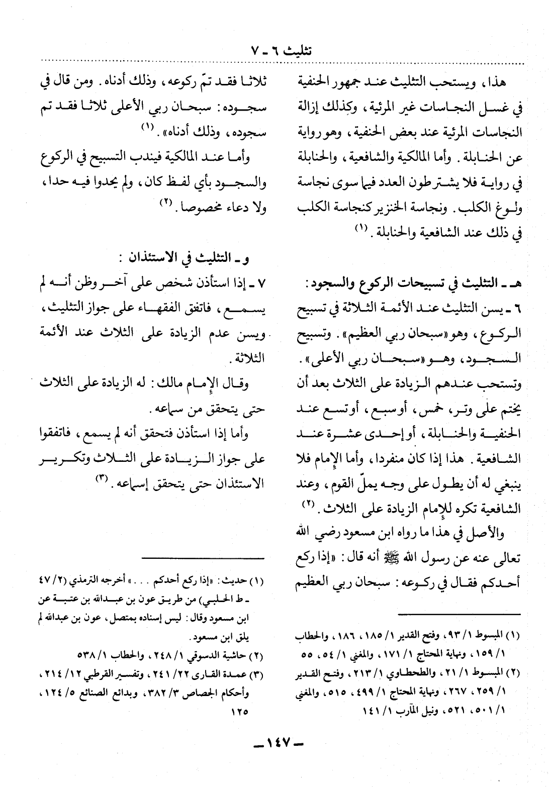 6 - يُسَنُّ التَّثْلِيثُ عِنْدَ الأَْئِمَّةِ الثَّلاَثَةِ فِي تَسْبِيحِ الرُّكُوعِ، وَهُوَ " سُبْحَانَ رَبِّيَ الْعَظِيمِ "، وَتَسْبِيحِ السُّجُودِ، وَهُوَ " سُبْحَانَ رَبِّيَ الأَْعْلَى ". وَتُسْتَحَبُّ عِنْدَهُمُ الزِّيَادَةُ عَلَى الثَّلاَثِ بَعْدَ أَنْ يَخْتِمَ عَلَى وِتْرٍ، خَمْسٍ، أَوْ سَبْعٍ، أَوْ تِسْعٍ عِنْدَ الْحَنَفِيَّةِ وَالْحَنَابِلَةِ، أَوْ إِحْدَى عَشْرَةَ عِنْدَ الشَّافِعِيَّةِ. هَذَا إِذَا كَانَ مُنْفَرِدًا، وَأَمَّا الإِْمَامُ فَلاَ يَنْبَغِي لَهُ أَنْ يُطَوِّل عَلَى وَجْهٍ يَمَل الْقَوْمُ، وَعِنْدَ الشَّافِعِيَّةِ تُكْرَهُ لِلإِْمَامِ الزِّيَادَةُ عَلَى الثَّلاَثِ. (2)