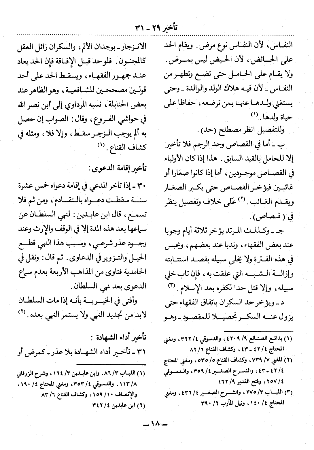 30 - إِذَا تَأَخَّرَ الْمُدَّعِي فِي إِقَامَةِ دَعْوَاهُ خَمْسَ عَشْرَةَ سَنَةً سَقَطَتْ دَعْوَاهُ بِالتَّقَادُمِ، وَمِنْ ثَمَّ فَلاَ تُسْمَعُ، قَال ابْنُ عَابِدِينَ: لِنَهْيِ السُّلْطَانِ عَنْ سَمَاعِهَا بَعْدَ هَذِهِ الْمُدَّةِ إِلاَّ فِي الْوَقْفِ وَالإِْرْثِ وَعِنْدَ وُجُودِ عُذْرٍ شَرْعِيٍّ، وَسَبَبُ هَذَا النَّهْيِ قَطْعُ الْحِيَل وَالتَّزْوِيرِ فِي الدَّعَاوَى. ثُمَّ قَال: وَنُقِل فِي الْحَامِدِيَّةِ فَتَاوَى مِنَ الْمَذَاهِبِ الأَْرْبَعَةِ بِعَدَمِ سَمَاعِ الدَّعْوَى بَعْدَ نَهْيِ السُّلْطَانِ.
