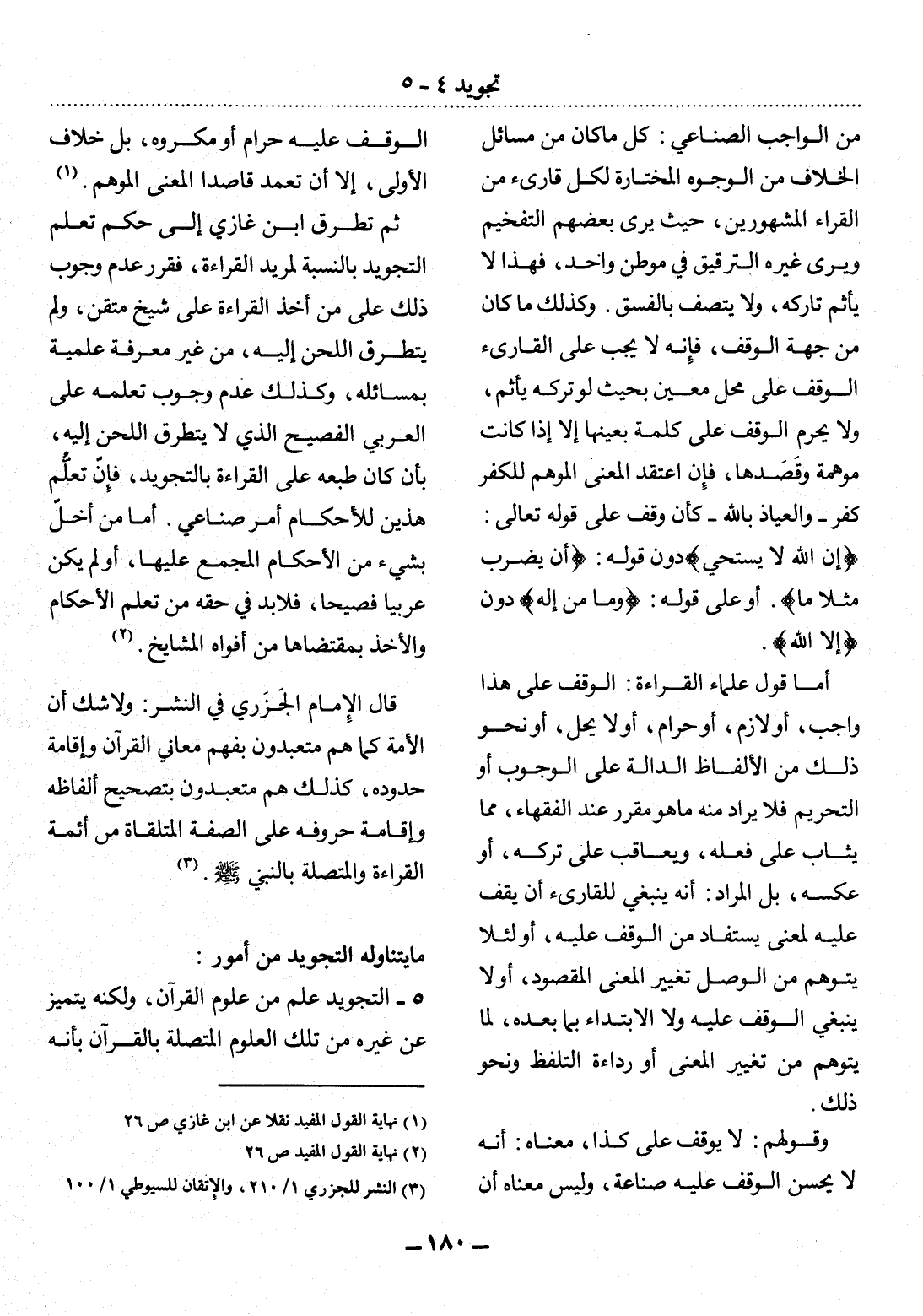 ثُمَّ تَطَرَّقَ ابْنُ غَازِيٍّ إِلَى حُكْمِ تَعَلُّمِ التَّجْوِيدِ بِالنِّسْبَةِ لِمُرِيدِ الْقِرَاءَةِ، فَقَرَّرَ عَدَمَ وُجُوبِ ذَلِكَ عَلَى مَنْ أَخَذَ الْقِرَاءَةَ عَلَى شَيْخٍ مُتْقِنٍ، وَلَمْ يَتَطَرَّقِ اللَّحْنُ إِلَيْهِ، مِنْ غَيْرِ مَعْرِفَةٍ عِلْمِيَّةٍ بِمَسَائِلِهِ، وَكَذَلِكَ عَدَمُ وُجُوبِ تَعَلُّمِهِ عَلَى الْعَرَبِيِّ الْفَصِيحِ الَّذِي لاَ يَتَطَرَّقُ اللَّحْنُ إِلَيْهِ، بِأَنْ كَانَ طَبْعُهُ عَلَى الْقِرَاءَةِ بِالتَّجْوِيدِ، فَإِنَّ تَعَلُّمَ هَذَيْنِ لِلأَْحْكَامِ أَمْرٌ صِنَاعِيٌّ. أَمَّا مَنْ أَخَل بِشَيْءٍ مِنَ الأَْحْكَامِ الْمُجْمَعِ عَلَيْهَا، أَوْ لَمْ يَكُنْ عَرَبِيًّا فَصِيحًا، فَلاَ بُدَّ فِي حَقِّهِ مِنْ تَعَلُّمِ الأَْحْكَامِ وَالأَْخْذِ بِمُقْتَضَاهَا مِنْ أَفْوَاهِ الْمَشَايِخِ. (2)