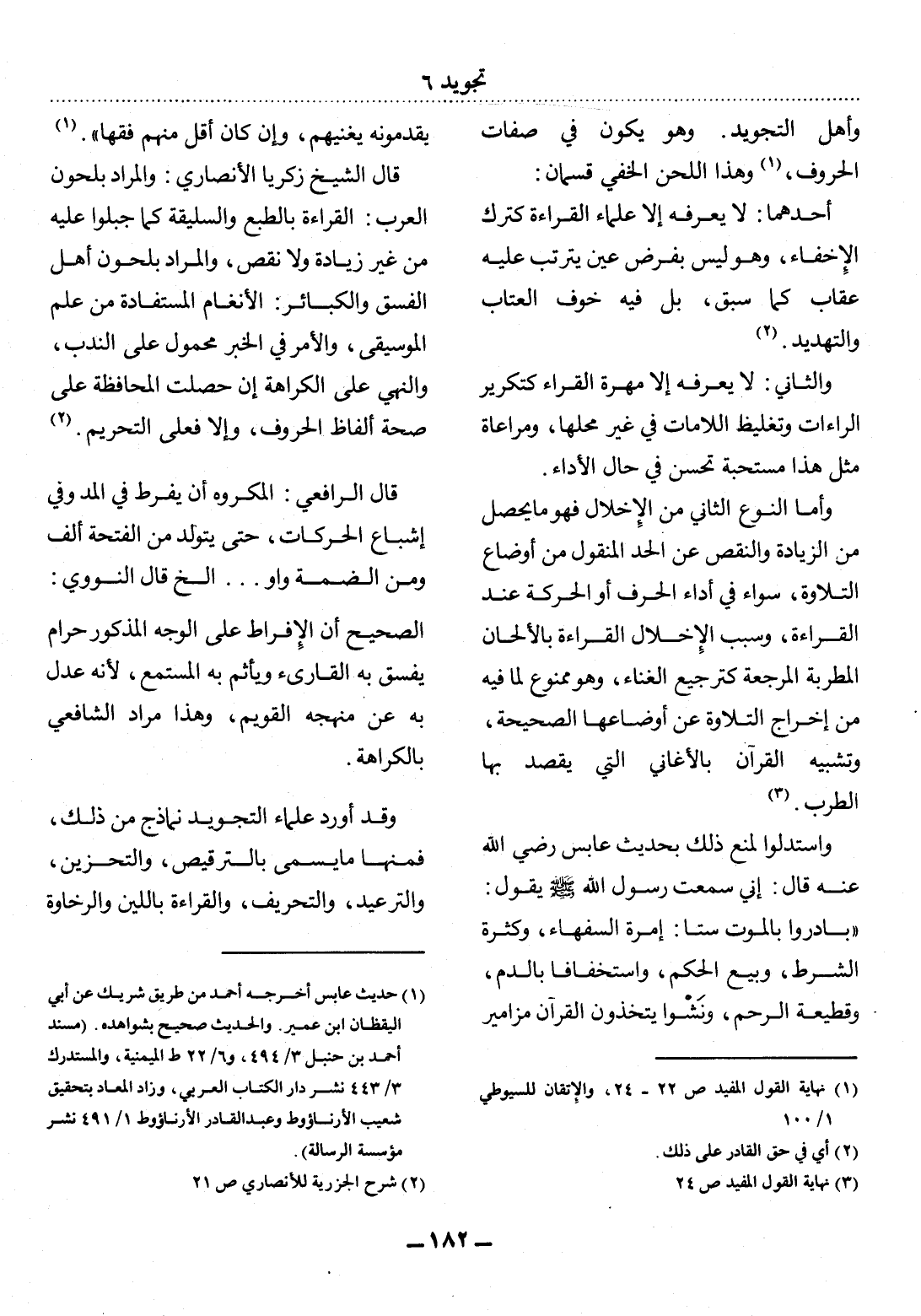 قَال الشَّيْخُ زَكَرِيَّا الأَْنْصَارِيُّ: وَالْمُرَادُ بِلُحُونِ الْعَرَبِ: الْقِرَاءَةُ بِالطَّبْعِ وَالسَّلِيقَةِ كَمَا جُبِلُوا عَلَيْهِ مِنْ غَيْرِ زِيَادَةٍ وَلاَ نَقْصٍ، وَالْمُرَادُ بِلُحُونِ أَهْل الْفِسْقِ وَالْكَبَائِرِ: الأَْنْغَامُ الْمُسْتَفَادَةُ مِنْ عِلْمِ الْمُوسِيقَى، وَالأَْمْرُ فِي الْخَبَرِ مَحْمُولٌ عَلَى النَّدْبِ، وَالنَّهْيُ عَلَى الْكَرَاهَةِ إِنْ حَصَلَتِ الْمُحَافَظَةُ عَلَى صِحَّةِ أَلْفَاظِ الْحُرُوفِ، وَإِلاَّ فَعَلَى التَّحْرِيمِ (2) .