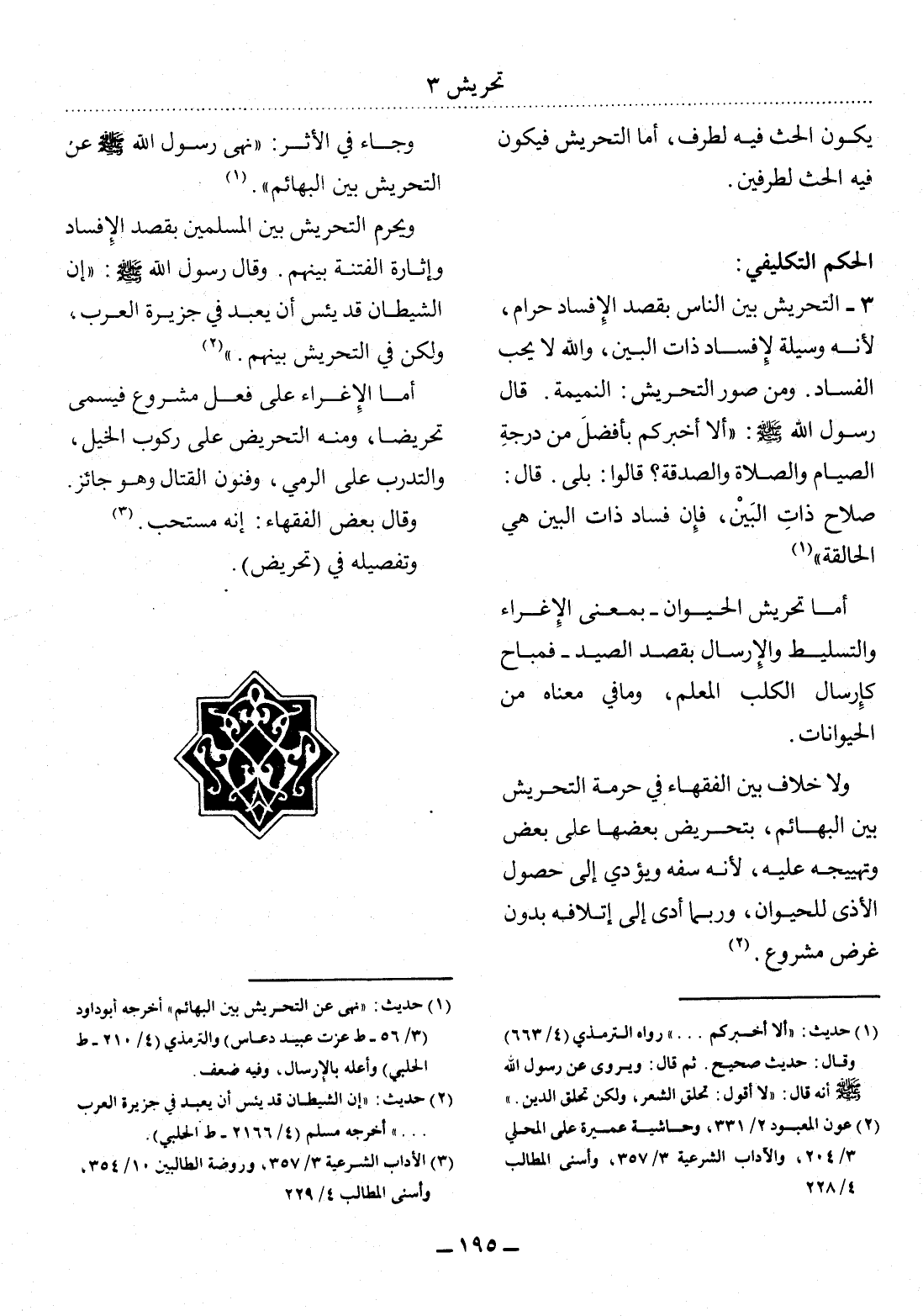 وَيَحْرُمُ التَّحْرِيشُ بَيْنَ الْمُسْلِمِينَ بِقَصْدِ الإِْفْسَادِ وَإِثَارَةِ الْفِتْنَةِ بَيْنَهُمْ. وَقَال رَسُول اللَّهِ صَلَّى اللَّهُ عَلَيْهِ وَسَلَّمَ: إِنَّ الشَّيْطَانَ قَدْ يَئِسَ أَنْ يُعْبَدَ فِي جَزِيرَةِ الْعَرَبِ، وَلَكِنْ فِي التَّحْرِيشِ بَيْنَهُمْ (2) .