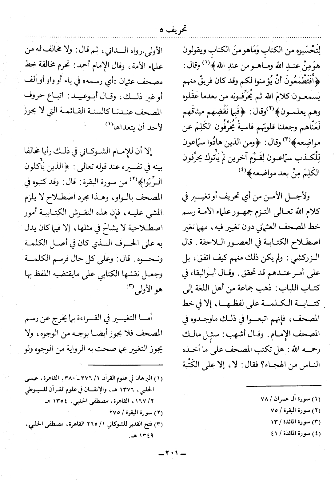 لِتَحْسَبُوهُ مِنَ الْكِتَابِ وَمَا هُوَ مِنَ الْكِتَابِ وَيَقُولُونَ هُوَ مِنْ عِنْدِ اللَّهِ وَمَا هُوَ مِنْ عِنْدِ اللَّهِ} (1) وَقَال: {أَفَتَطْمَعُونَ أَنْ يُؤْمِنُوا لَكُمْ وَقَدْ كَانَ فَرِيقٌ مِنْهُمْ يَسْمَعُونَ كَلاَمَ اللَّهِ ثُمَّ يُحَرِّفُونَهُ مِنْ بَعْدِ مَا عَقَلُوهُ وَهُمْ يَعْلَمُونَ} (2) وَقَال: {فَبِمَا نَقْضِهِمْ مِيثَاقَهُمْ لَعَنَّاهُمْ وَجَعَلْنَا قُلُوبَهُمْ قَاسِيَةً يُحَرِّفُونَ الْكَلِمَ عَنْ مَوَاضِعِهِ} (3) وَقَال: {وَمِنَ الَّذِينَ هَادُوا سَمَّاعُونَ لِلْكَذِبِ سَمَّاعُونَ لِقَوْمٍ آخَرِينَ لَمْ يَأْتُوكَ يُحَرِّفُونَ الْكَلِمَ مِنْ بَعْدِ مَوَاضِعِهِ} (4)