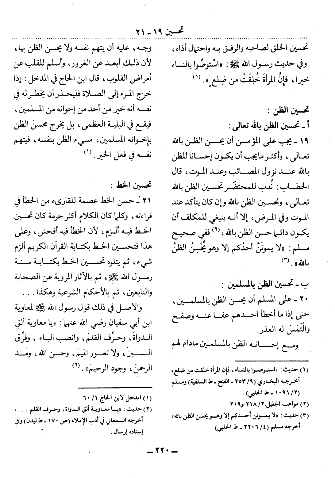 21 - حُسْنُ الْخَطِّ عِصْمَةٌ لِلْقَارِئِ مِنَ الْخَطَأِ فِي قِرَاءَتِهِ، وَكُلَّمَا كَانَ الْكَلاَمُ أَكْثَرَ حُرْمَةً كَانَ تَحْسِينُ الْخَطِّ فِيهِ أَلْزَمَ؛ لأَِنَّ الْخَطَأَ فِيهِ أَفْحَشُ، وَعَلَى هَذَا فَتَحْسِينُ الْخَطِّ بِكِتَابَةِ الْقُرْآنِ الْكَرِيمِ أَلْزَمُ شَيْءٍ، ثُمَّ يَتْلُوهُ تَحْسِينُ الْخَطِّ بِكِتَابَةِ سُنَّةِ رَسُول اللَّهِ صَلَّى اللَّهُ عَلَيْهِ وَسَلَّمَ ثُمَّ بِالآْثَارِ الْمَرْوِيَّةِ عَنِ الصَّحَابَةِ وَالتَّابِعِينَ، ثُمَّ بِالأَْحْكَامِ الشَّرْعِيَّةِ وَهَكَذَا. .
