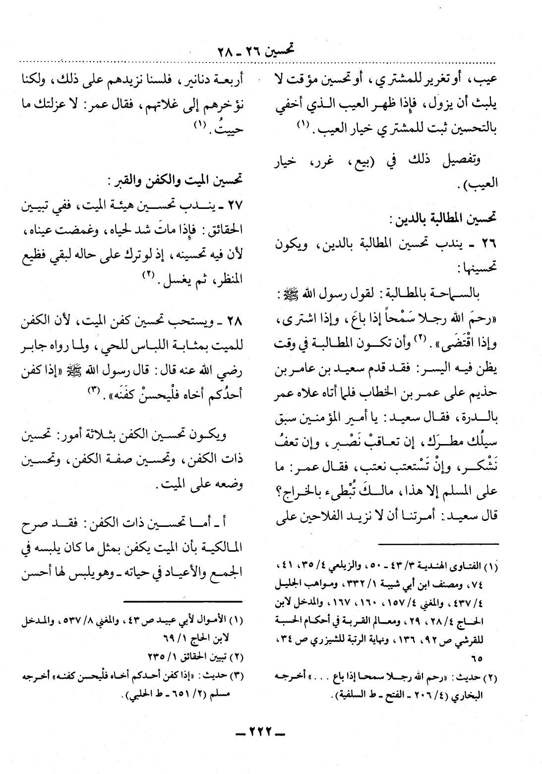 26 - يُنْدَبُ تَحْسِينُ الْمُطَالَبَةِ بِالدَّيْنِ، وَيَكُونُ تَحْسِينُهَا: بِالسَّمَاحَةِ بِالْمُطَالَبَةِ: لِقَوْل رَسُول اللَّهِ صَلَّى اللَّهُ عَلَيْهِ وَسَلَّمَ: رَحِمَ اللَّهُ رَجُلاً سَمْحًا إِذَا بَاعَ، وَإِذَا اشْتَرَى، وَإِذَا اقْتَضَى (2) . وَأَنْ تَكُونَ الْمُطَالَبَةُ فِي وَقْتٍ يُظَنُّ فِيهِ الْيُسْرُ: فَقَدْ قَدِمَ سَعِيدُ بْنُ عَامِرِ بْنِ حِذْيَمٍ عَلَى عُمَرَ بْنِ الْخَطَّابِ فَلَمَّا أَتَاهُ عَلاَهُ عُمَرُ بِالدِّرَّةِ، فَقَال سَعِيدٌ: يَا أَمِيرَ الْمُؤْمِنِينَ سَبَقَ سَيْلُكَ مَطَرَكَ، إِنْ تُعَاقِبْ نَصْبِرْ، وَإِنْ تَعْفُ نَشْكُرْ، وَإِنْ تَسْتَعْتِبْ نَعْتِبْ، فَقَال عُمَرُ: مَا عَلَى الْمُسْلِمِ إِلاَّ هَذَا، مَا لَكَ تُبْطِئُ بِالْخَرَاجِ؟ قَال سَعِيدٌ: أَمَرْتنَا أَنْ لاَ نَزِيدَ الْفَلاَّحِينَ عَلَى