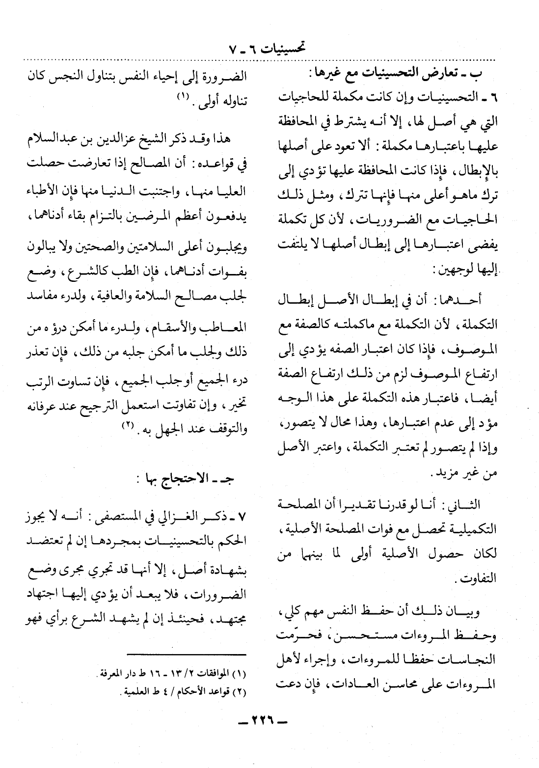 6 - التَّحْسِينِيَّاتُ وَإِنْ كَانَتْ مُكَمِّلَةً لِلْحَاجِيَّاتِ الَّتِي هِيَ أَصْلٌ لَهَا، إِلاَّ أَنَّهُ يُشْتَرَطُ فِي الْمُحَافَظَةِ عَلَيْهَا بِاعْتِبَارِهَا مُكَمِّلَةً: أَلاَّ تَعُودَ عَلَى أَصْلِهَا بِالإِْبْطَال، فَإِذَا كَانَتِ الْمُحَافَظَةُ عَلَيْهَا تُؤَدِّي إِلَى تَرْكِ مَا هُوَ أَعْلَى مِنْهَا فَإِنَّهَا تُتْرَكُ، وَمِثْل ذَلِكَ الْحَاجِيَّاتُ مَعَ الضَّرُورِيَّاتِ، لأَِنَّ كُل تَكْمِلَةٍ يُفْضِي اعْتِبَارُهَا إِلَى إِبْطَال أَصْلِهَا لاَ يُلْتَفَتُ إِلَيْهَا لِوَجْهَيْنِ: