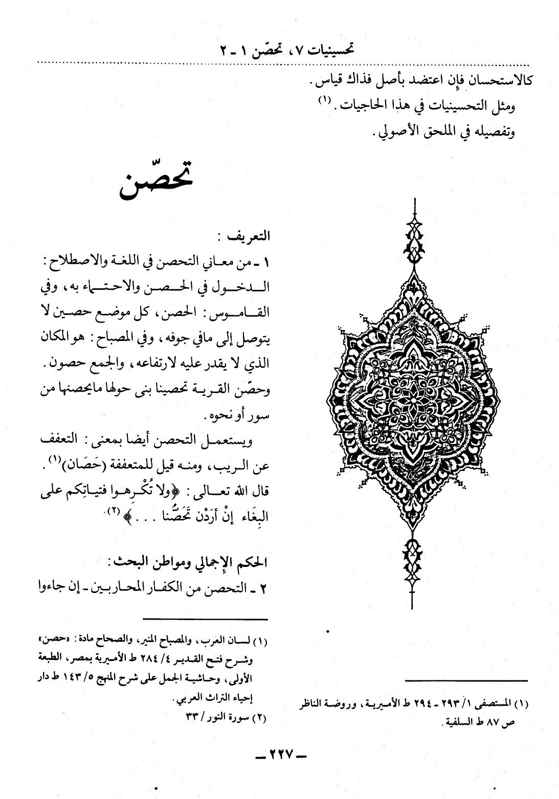 (1) لسان العرب، والمصباح المنير، والصحاح مادة: " حصن " وشرح فتح القدير 4 / 284 ط الأميرية بمصر، الطبعة الأولى، وحاشية الجمل على شرح المنهج 5 / 143 ط دار إحياء التراث العربي.