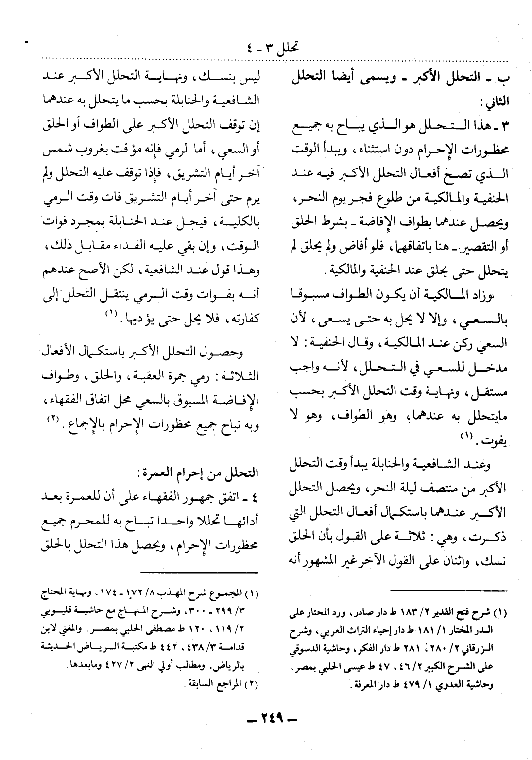 وَعِنْدَ الشَّافِعِيَّةِ وَالْحَنَابِلَةِ يَبْدَأُ وَقْتُ التَّحَلُّل الأَْكْبَرِ مِنْ مُنْتَصَفِ لَيْلَةِ النَّحْرِ، وَيَحْصُل التَّحَلُّل الأَْكْبَرُ عِنْدَهُمَا بِاسْتِكْمَال أَفْعَال التَّحَلُّل الَّتِي ذُكِرَتْ، وَهِيَ: ثَلاَثَةٌ عَلَى الْقَوْل بِأَنَّ الْحَلْقَ نُسُكٌ، وَاثْنَانِ عَلَى الْقَوْل الآْخَرِ غَيْرِ الْمَشْهُورِ أَنَّهُ