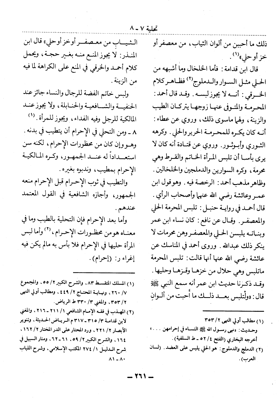 الثِّيَابِ مِنْ مُعَصْفَرٍ أَوْ خَزٍّ أَوْ حُلِيٍّ قَال ابْنُ الْمُنْذِرِ: لاَ يَجُوزُ الْمَنْعُ مِنْهُ بِغَيْرِ حُجَّةٍ، وَيُحْمَل كَلاَمُ أَحْمَدَ وَالْخِرَقِيِّ فِي الْمَنْعِ عَلَى الْكَرَاهَةِ لِمَا فِيهِ مِنَ الزِّينَةِ.